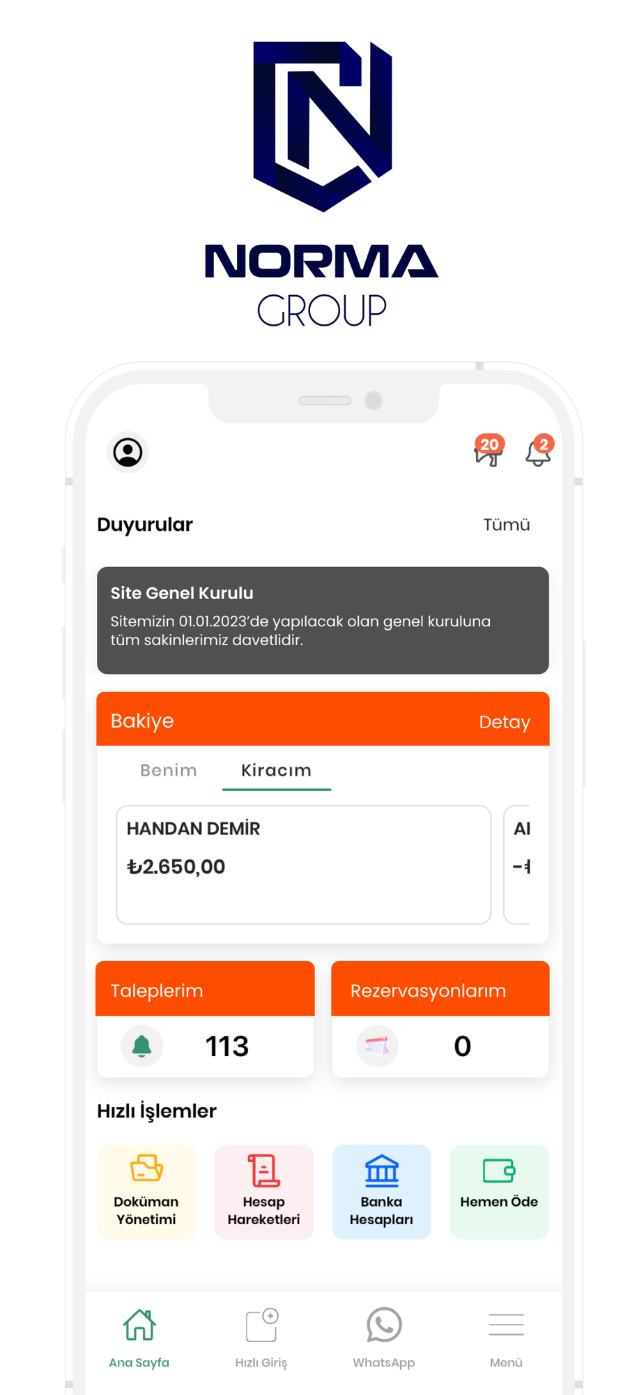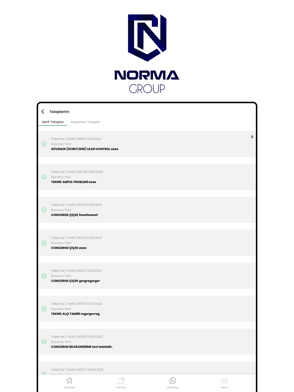• Taleplerim; Teknik, Güvenlik, Temizlik, Bahçe Bakım vb. hizmetlerinde tespit edilen olumsuz durumların fotoğrafını çekerek iş talebi oluşturma,