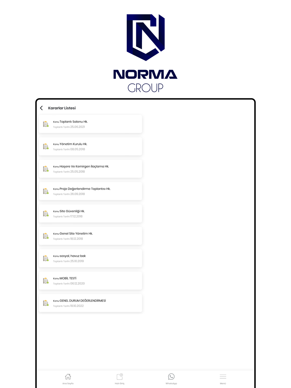Hazırlanan bu uygulama sayesinde site sakinleri aşağıda listelenen özellikler gibi bir çok işlemi yönetim ofislerine gitmeye gerek kalmadan uygulama üzerinden kolaylıkla sağlayabilir.