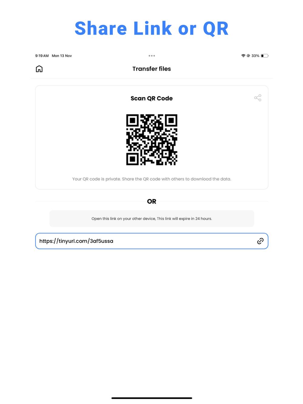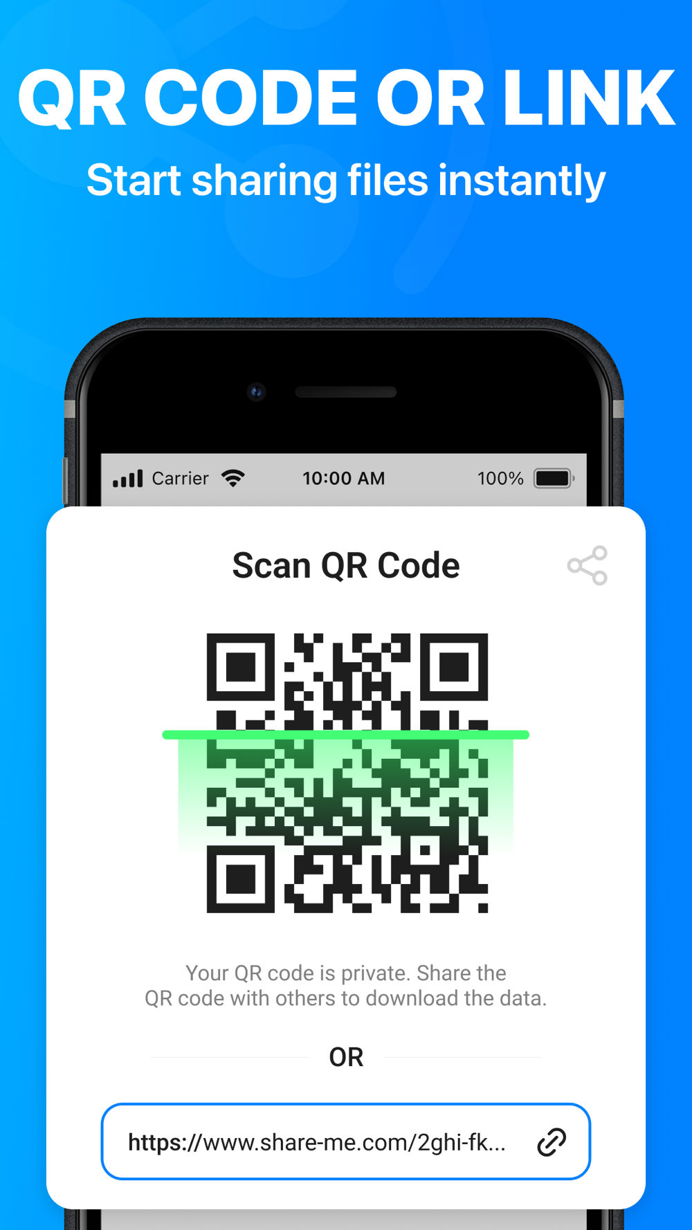 • File share with QR code. Share app generates a unique QR code for file you want to share. Just scan the code with another device to start the download all files.