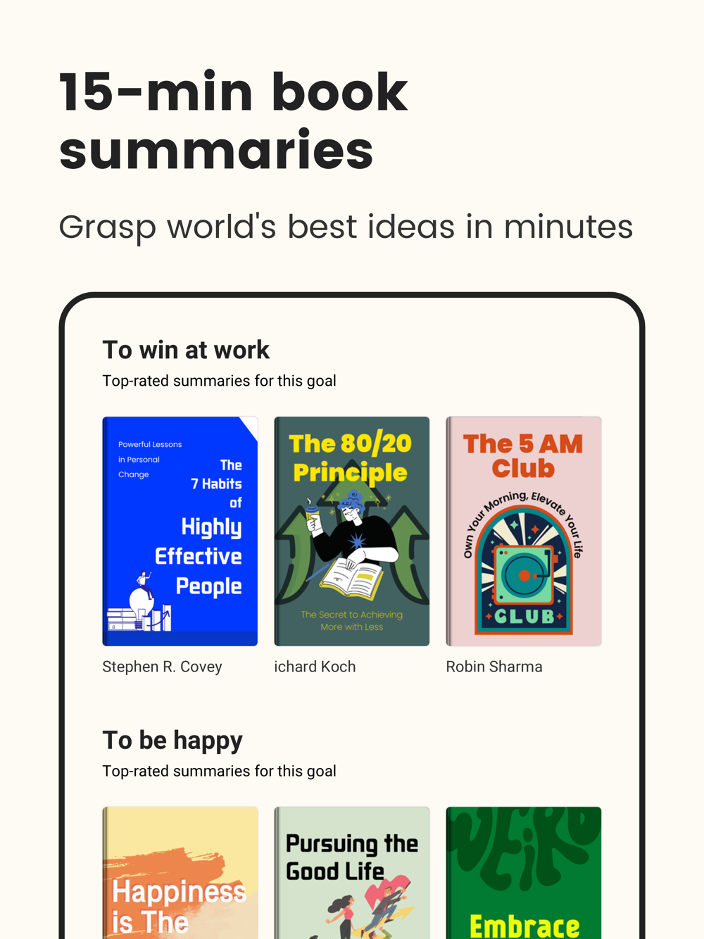 * 20+ categories: self-growth, business & money, productivity, happiness, health, family, etc.