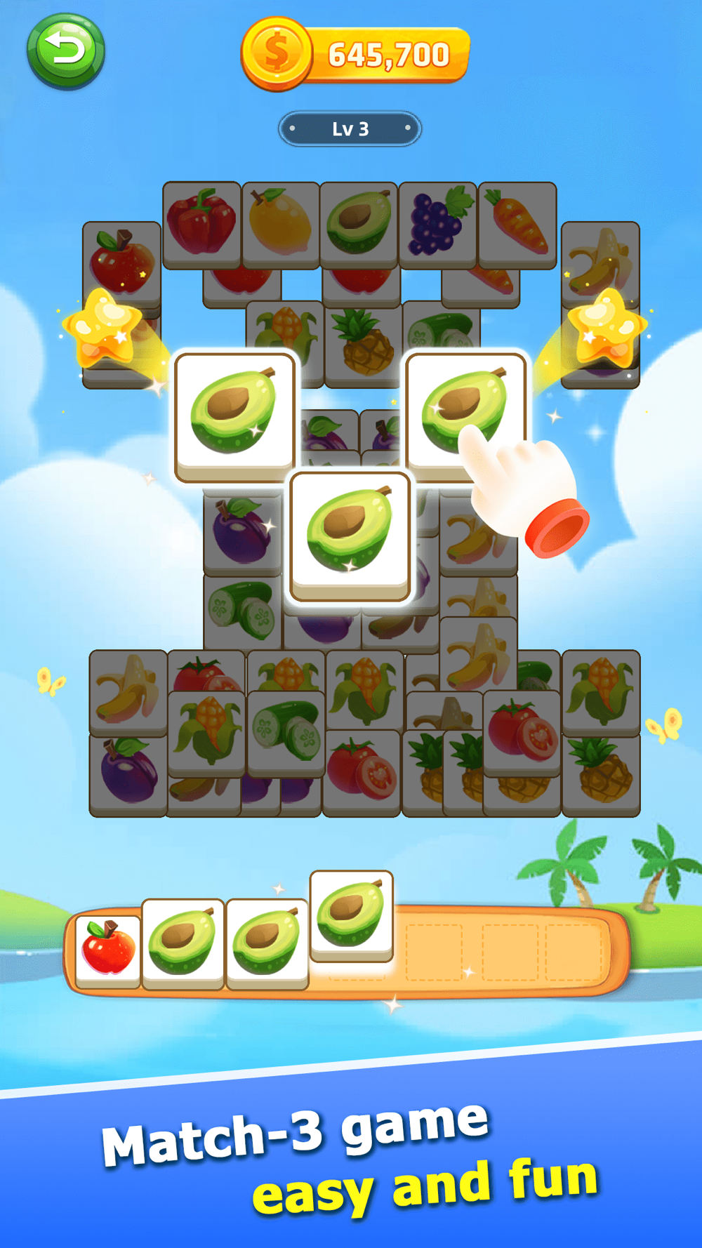Challenge: Clear all cards by matching three identical fruit patterns, testing your intelligence and skills.