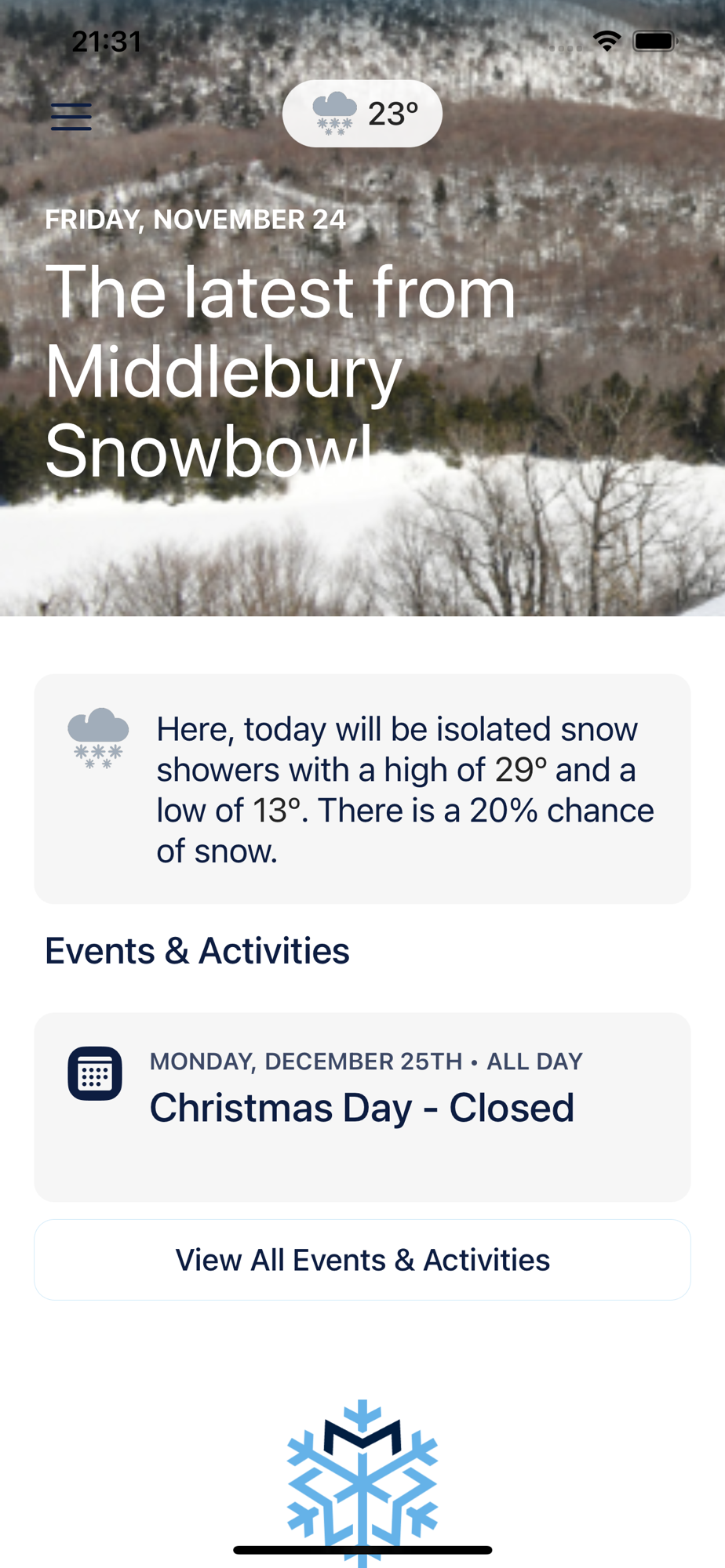 The all-new Ski Middlebury app puts everything you need to know about Middlebury Snowbowl and Rikert Outdoor Center at your fingertips, including: