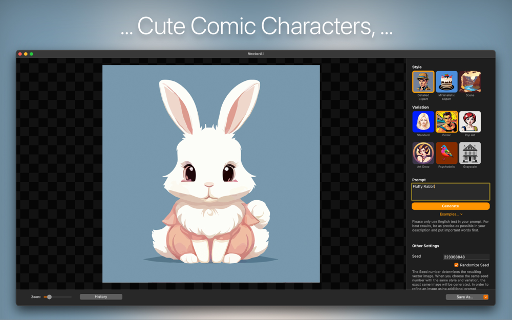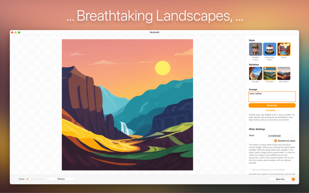 Do you need high-quality vector graphics quickly, such as a muffin or cake for the party invitation, a stack of gifts and balloons for the children's birthday, or landscape images for the intro of your vacation film? Of course, you could create these yourself, for example, using Logoist 5 – or you can use the brand-new VectorAI and simply tell the app via text input how you want your graphic to look. Just provide a few terms, and VectorAI will take over the work as your very own personal graphic designer!