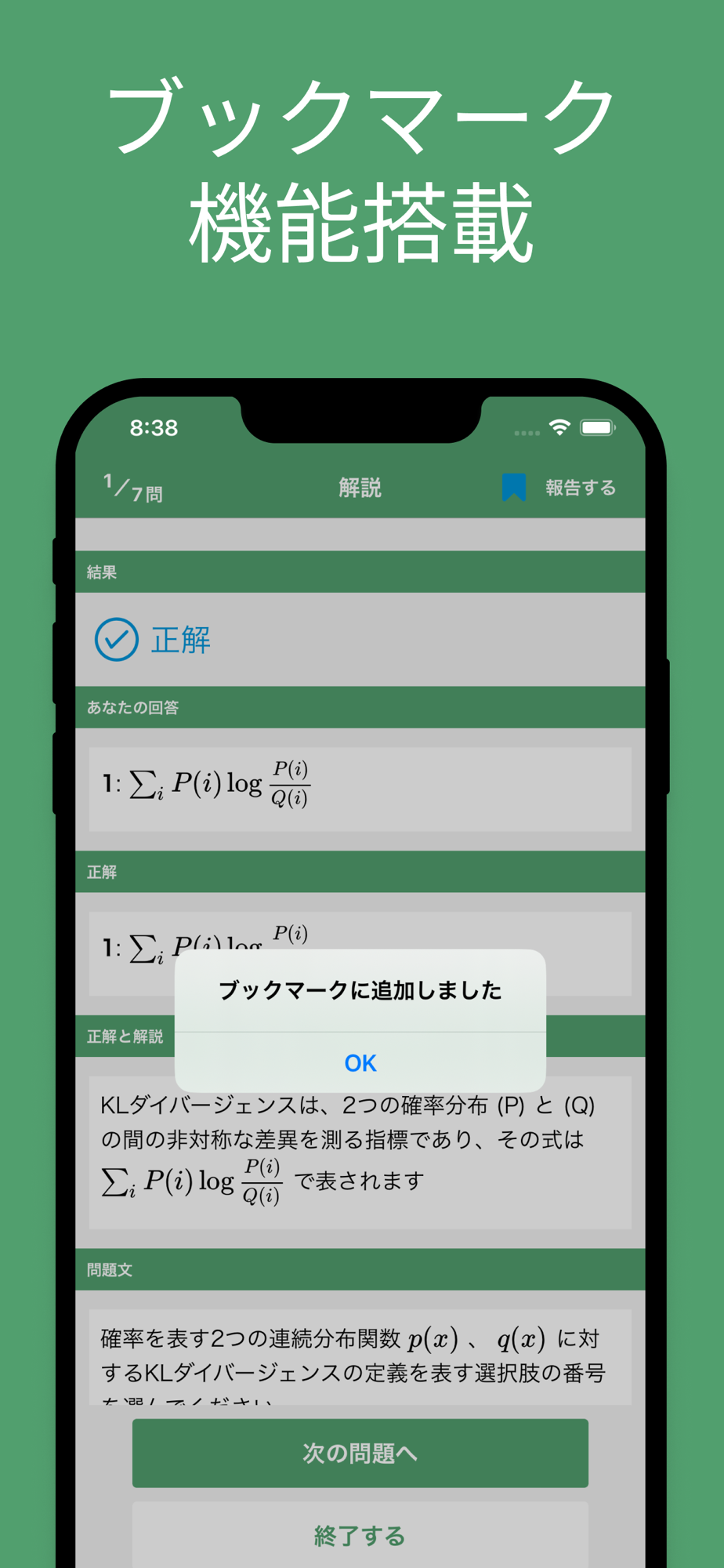 ブックマーク機能:重要問題や再確認したい問題をマークして、後から集中的に復習可能