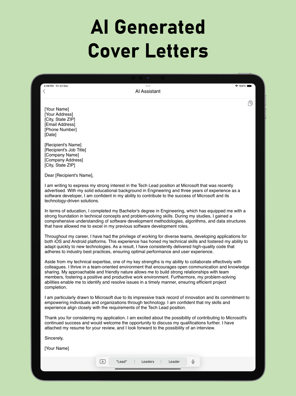 Say goodbye to writer's block! Cover Letter Pro suggests dynamic content and powerful keywords to enhance the impact of your cover letter. Let our AI guide you through the writing process, ensuring every sentence packs a punch.