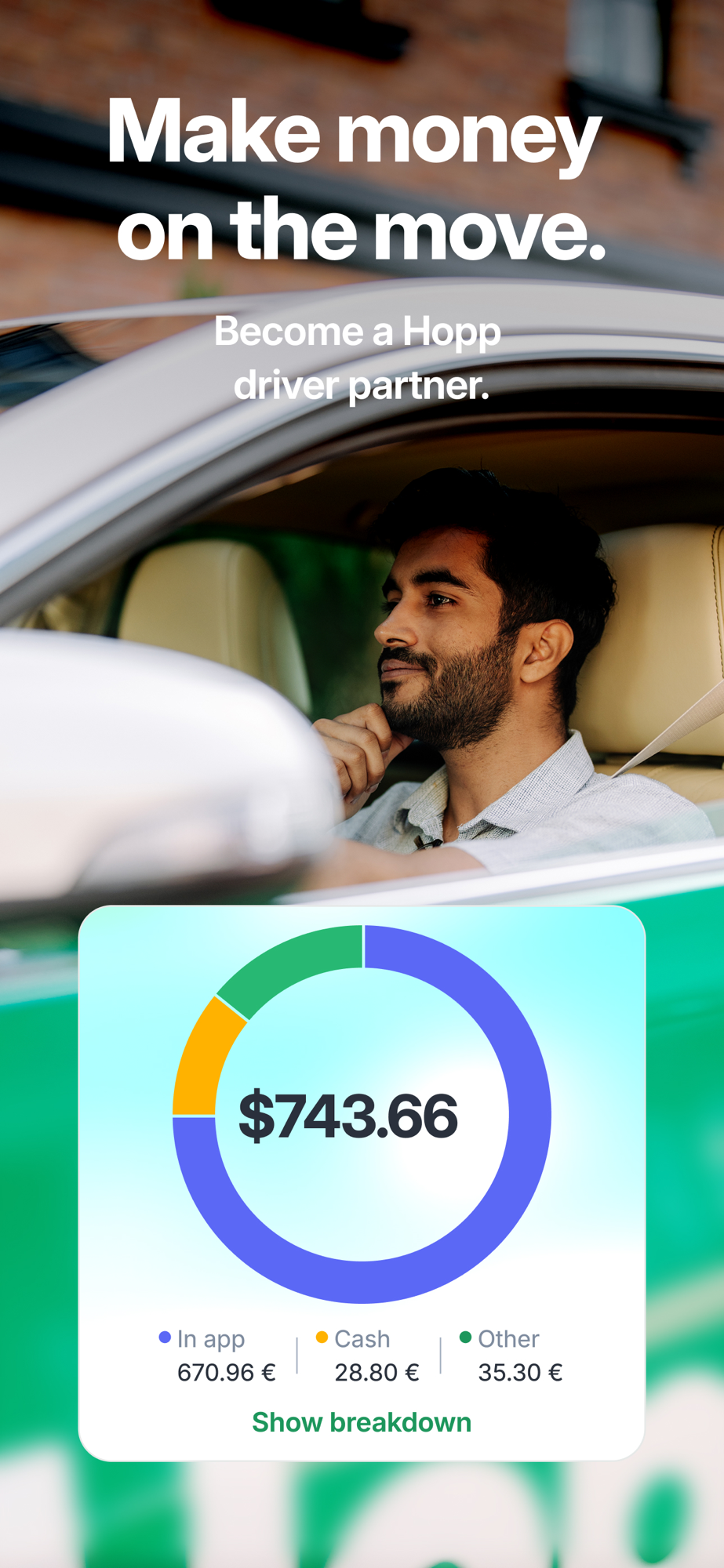 Hopp Driver helps you turn downtime into revenue with low service fees and flexible payments. Drive the hours you want and start earning money on the move.