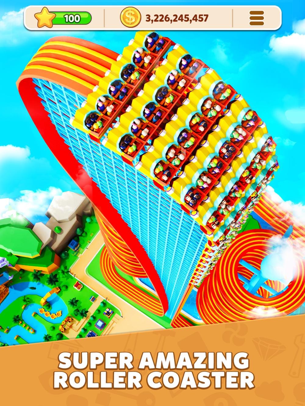 Manage a theme park: Build more creatively designed rides to attract visitors to your park. To provide them with a more comfortable and enjoyable experience, continuously upgrade and renovate the rides, add more seats, and improve the efficiency of the rides.