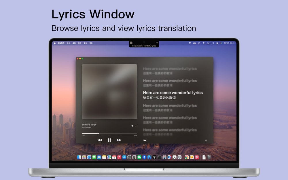 Display lyrics through a floating window anywhere. It supports custom styles and quick actions.