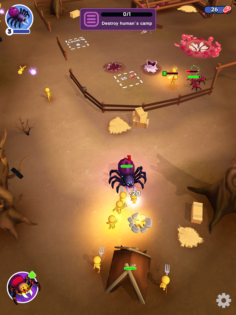 As the spider queen, get rid of the annoying humans who have invaded your territory. They have come to your territory, so they should prepare to die. Wrap the prey in cocoons, take it to the lair barn, plant eggs, and feed the little spiders so that they turn into strong warriors ready to defend the lair. But be careful: the bigger your colony, the more powerful the weapons the vile people bring.