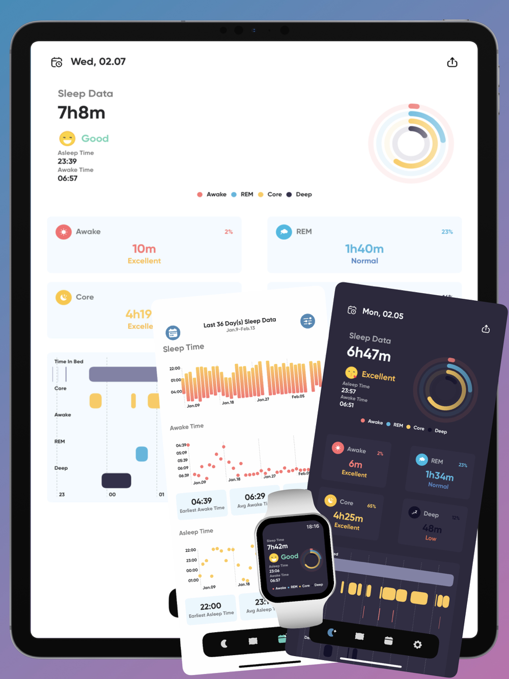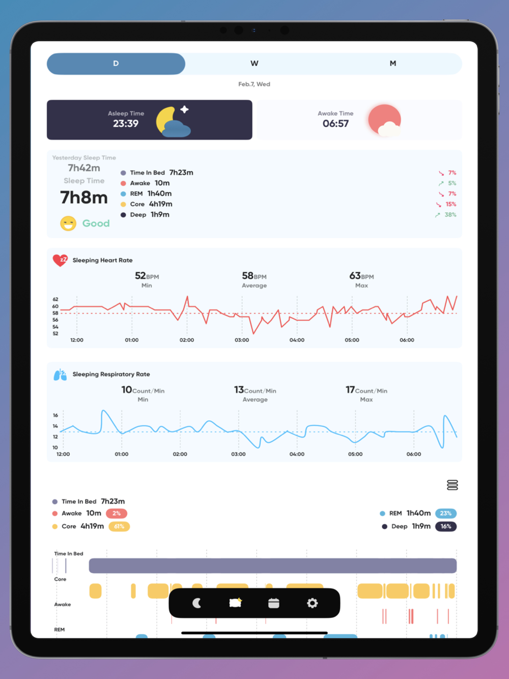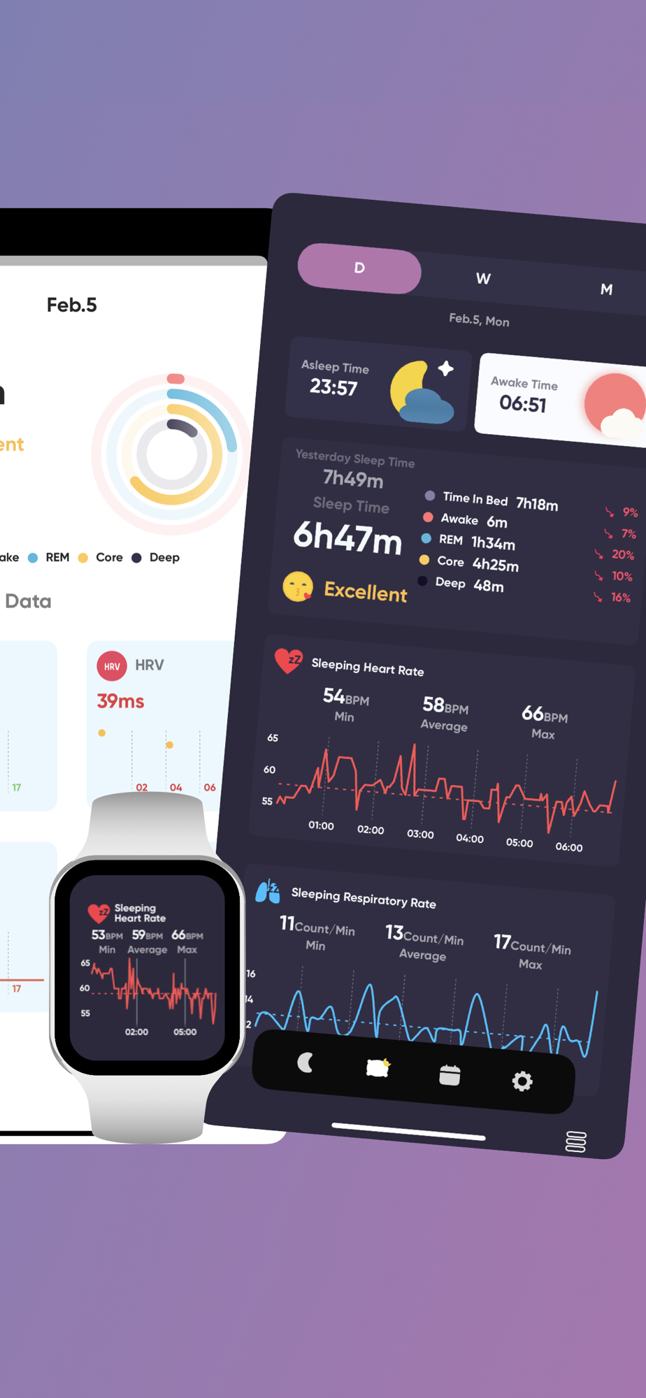 - Detailed sleep stage diagram (Awake, REM, Core Sleep, Deep Sleep) and sleep rate.
