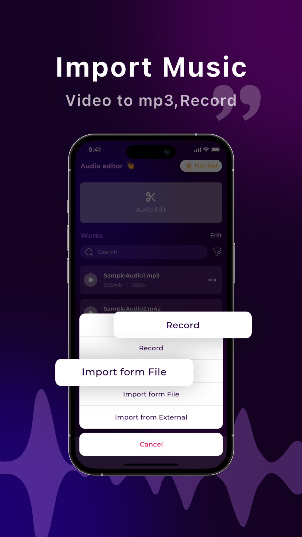 Bem-vindo ao Audio Editor, uma ferramenta profissional de edição musical. Com recursos poderosos e uma interface intuitiva, o Audio Editor permite que você libere sua criatividade e leve seus projetos de áudio para o próximo nível. Seja você um músico, podcaster ou entusiasta de áudio, o Audio Editor oferece um conjunto abrangente de ferramentas para converter formatos de áudio, editar gravações e aplicar técnicas de edição de nível profissional com facilidade.