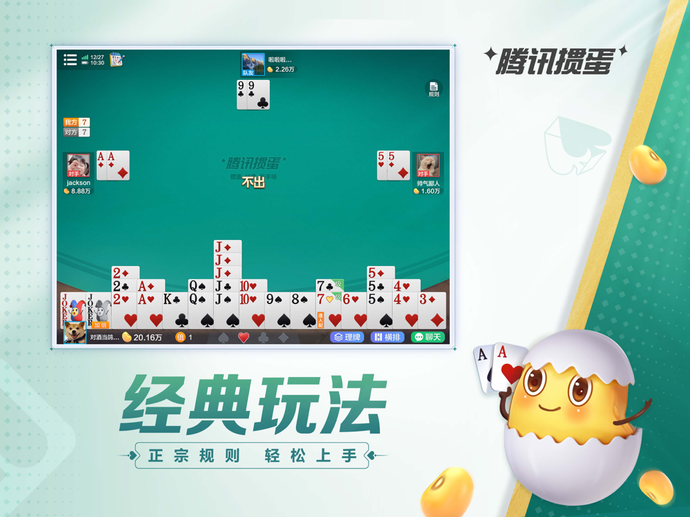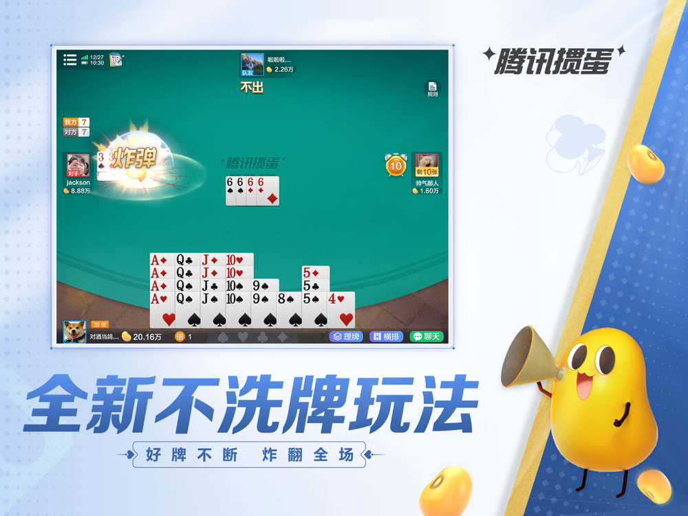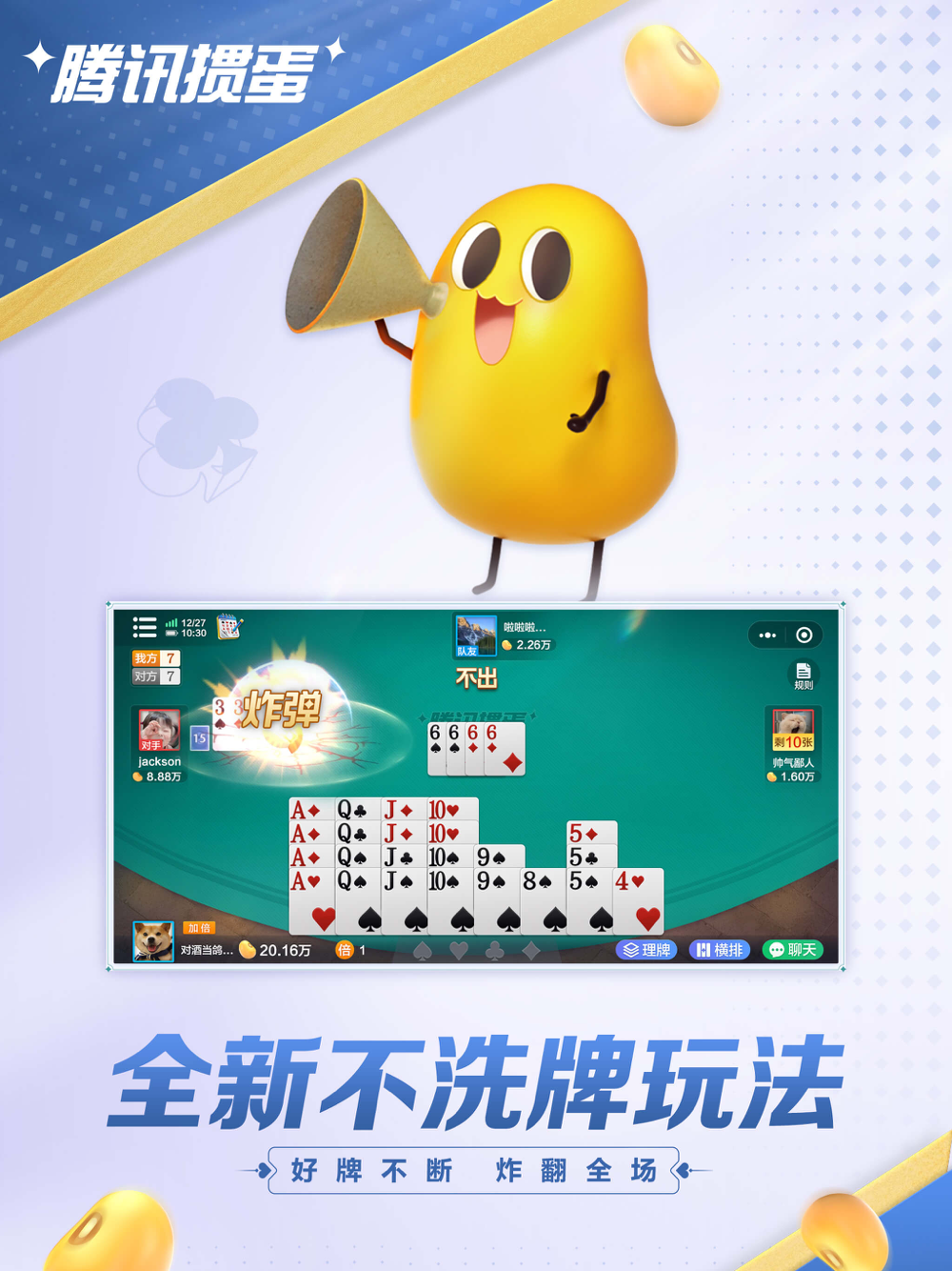 《腾讯掼蛋》是一款棋牌类游戏,掼蛋是一种在华东为主, 淮安以及周边地区广为流传的扑克游戏。腾讯掼蛋玩法丰富:包括经安徽和江苏等地的经典玩法,更有不洗牌加倍等玩法,也可以邀请好友一起玩,棋牌合集中可以体验其他扑克玩法。