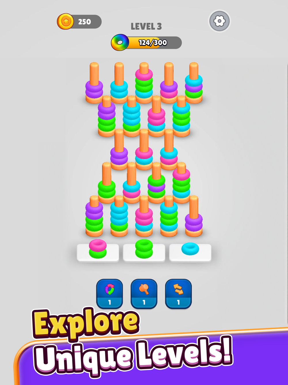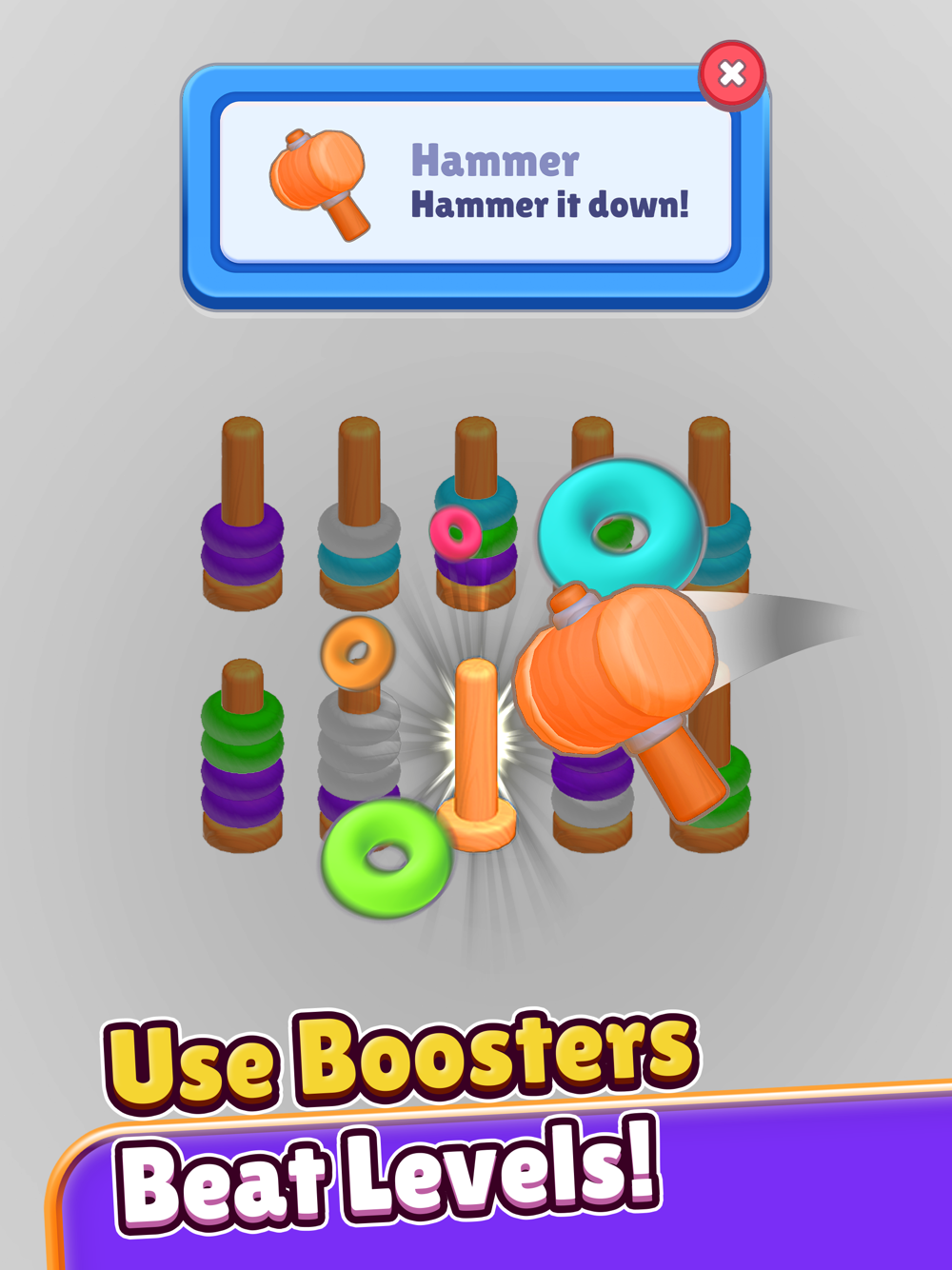Challenge your mind with this addictively fun puzzle game where you merge hoops onto sticks to match colors and clear the board. Simply drag and drop hoops onto sticks, and watch as they automatically sort themselves to create satisfying matches.