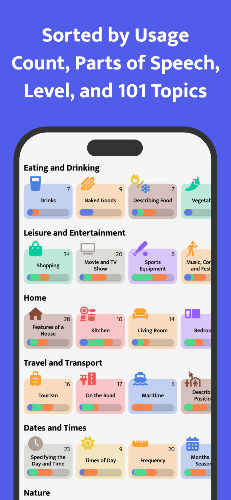 - Filter by levels (A1, A2, B1, B2), over 100 topics, categories, and sub-categories (e.g. family, food, entertainment, home, time, work, nature, body, travel, society, feelings, health, education, technology), and parts of speech (adjectives, nouns, verbs, adverbs, pronouns, prepositions, conjunctions)