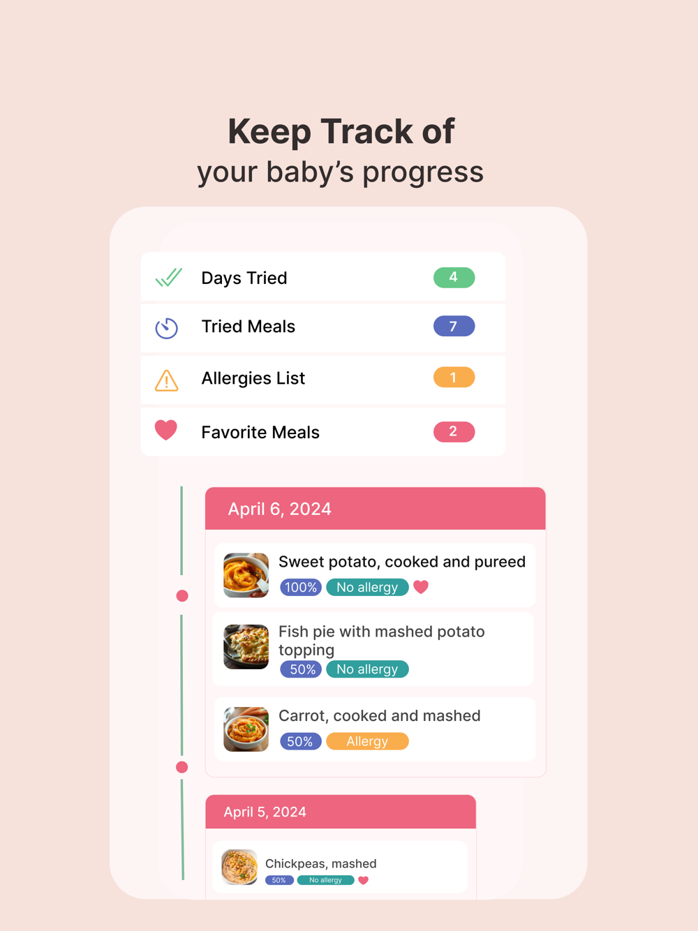 - First Foods Tracker: Log your baby’s first foods and monitor allergen introduction.