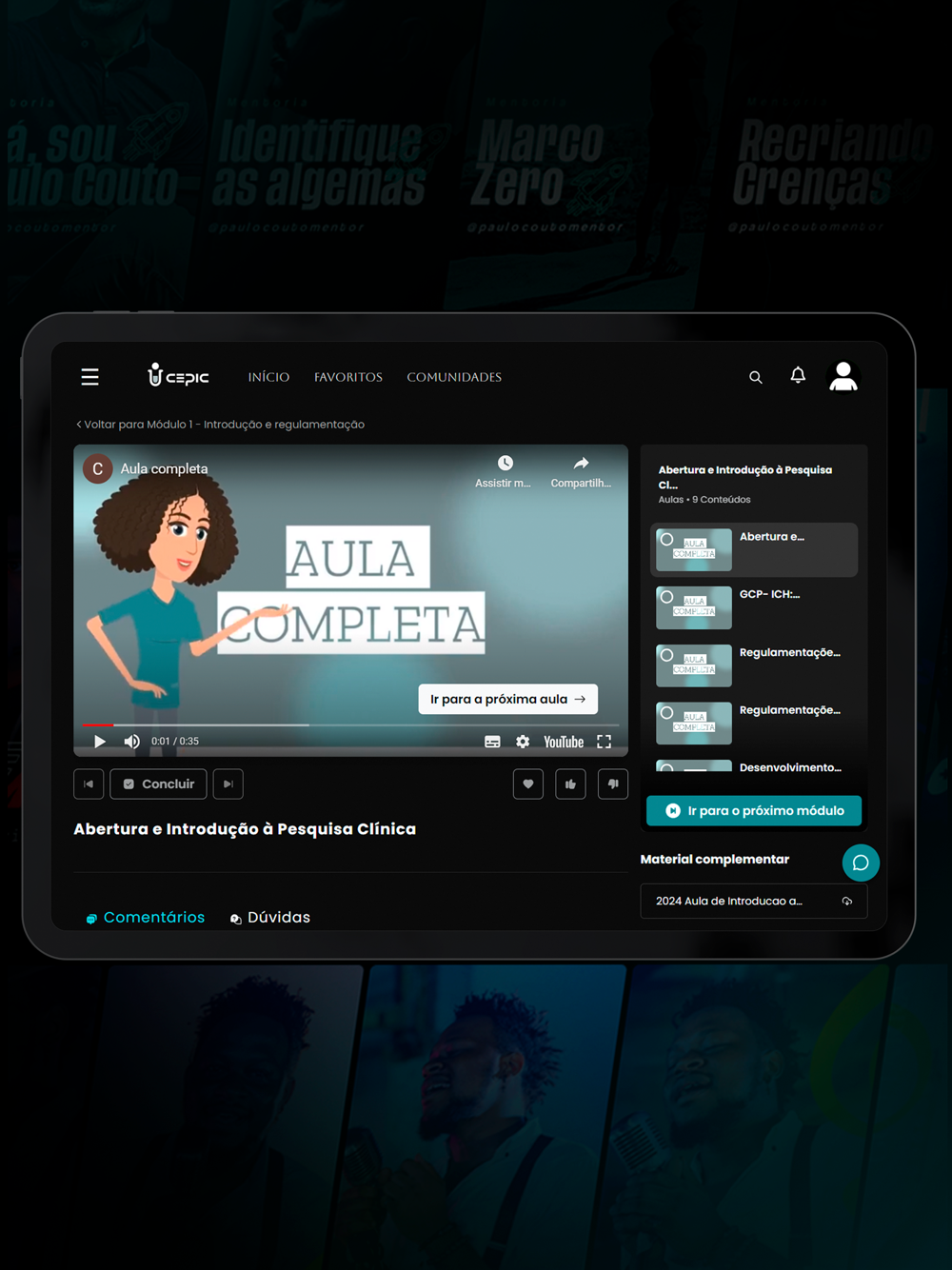 O CEPIC oferece cursos de Profissionalização em Pesquisa Clínica, Gestão Avançada em Pesquisa Clínica, Imersão prática: Simulador em um Centro Real, entre outros. Com o nosso aplicativo você conseguirá acessar às aulas, os materiais e todo o conteúdo oferecido, na palma da sua mão.