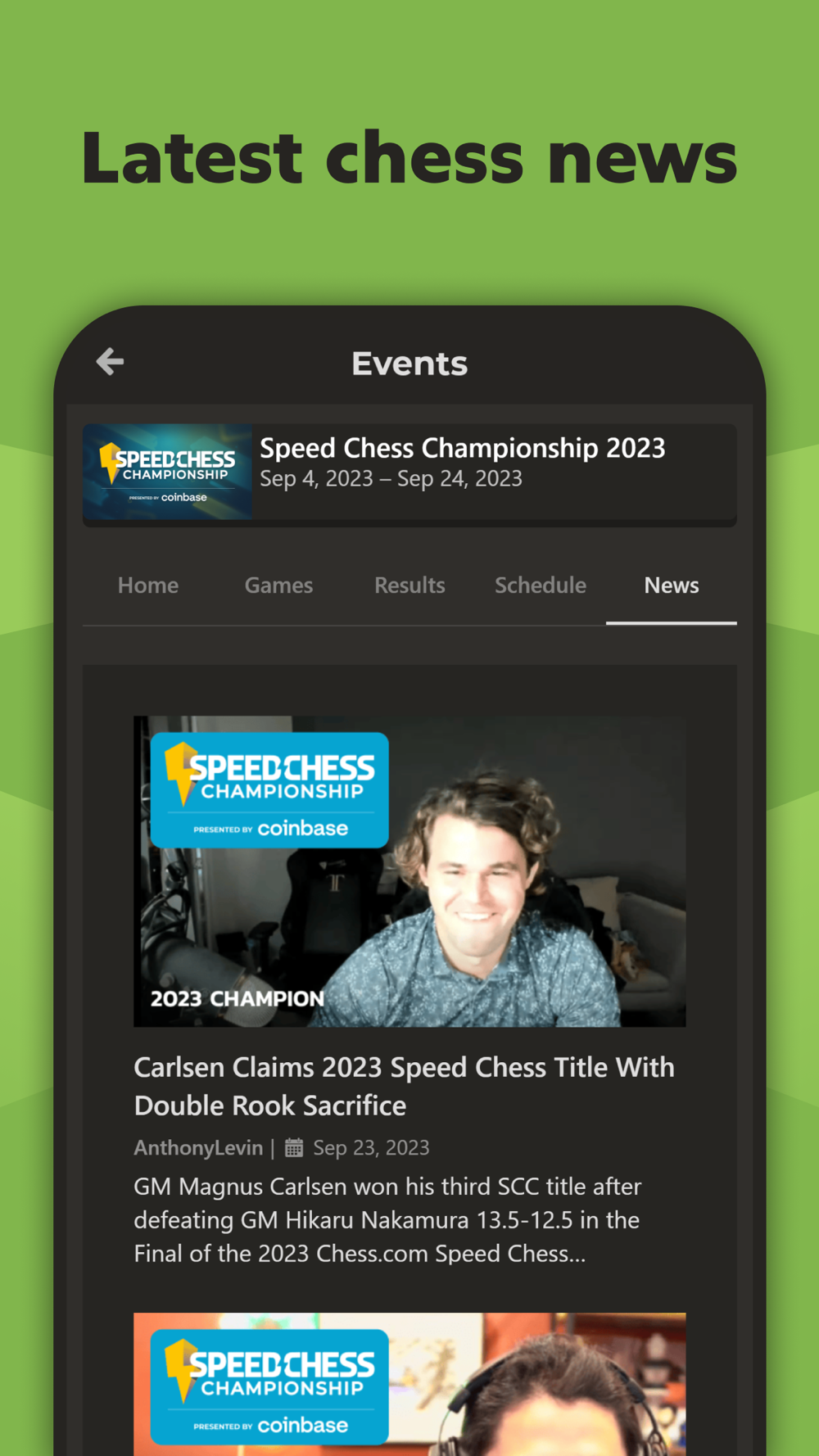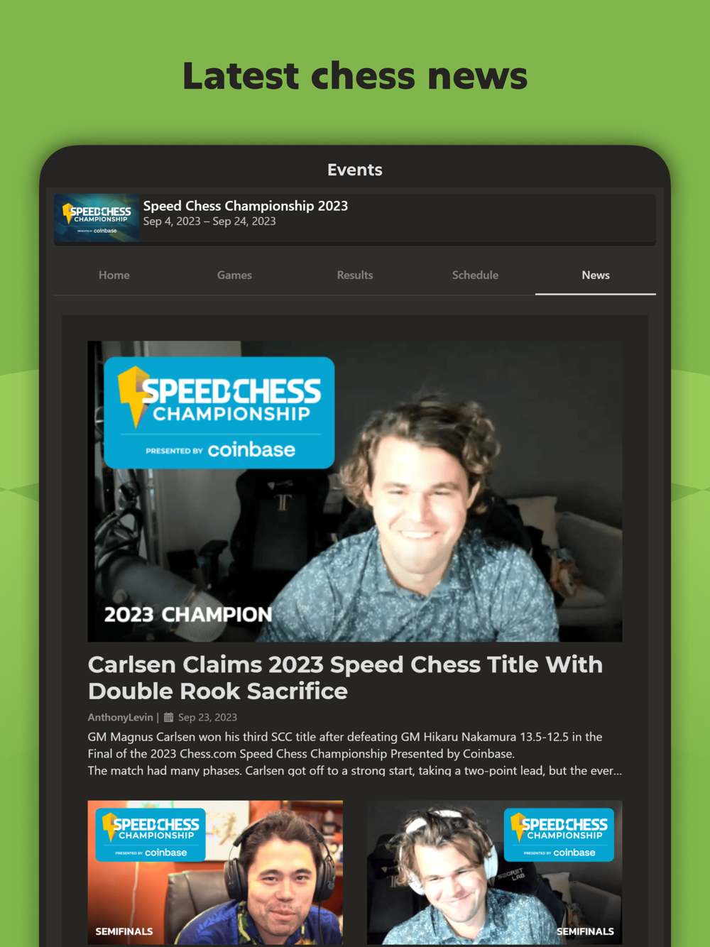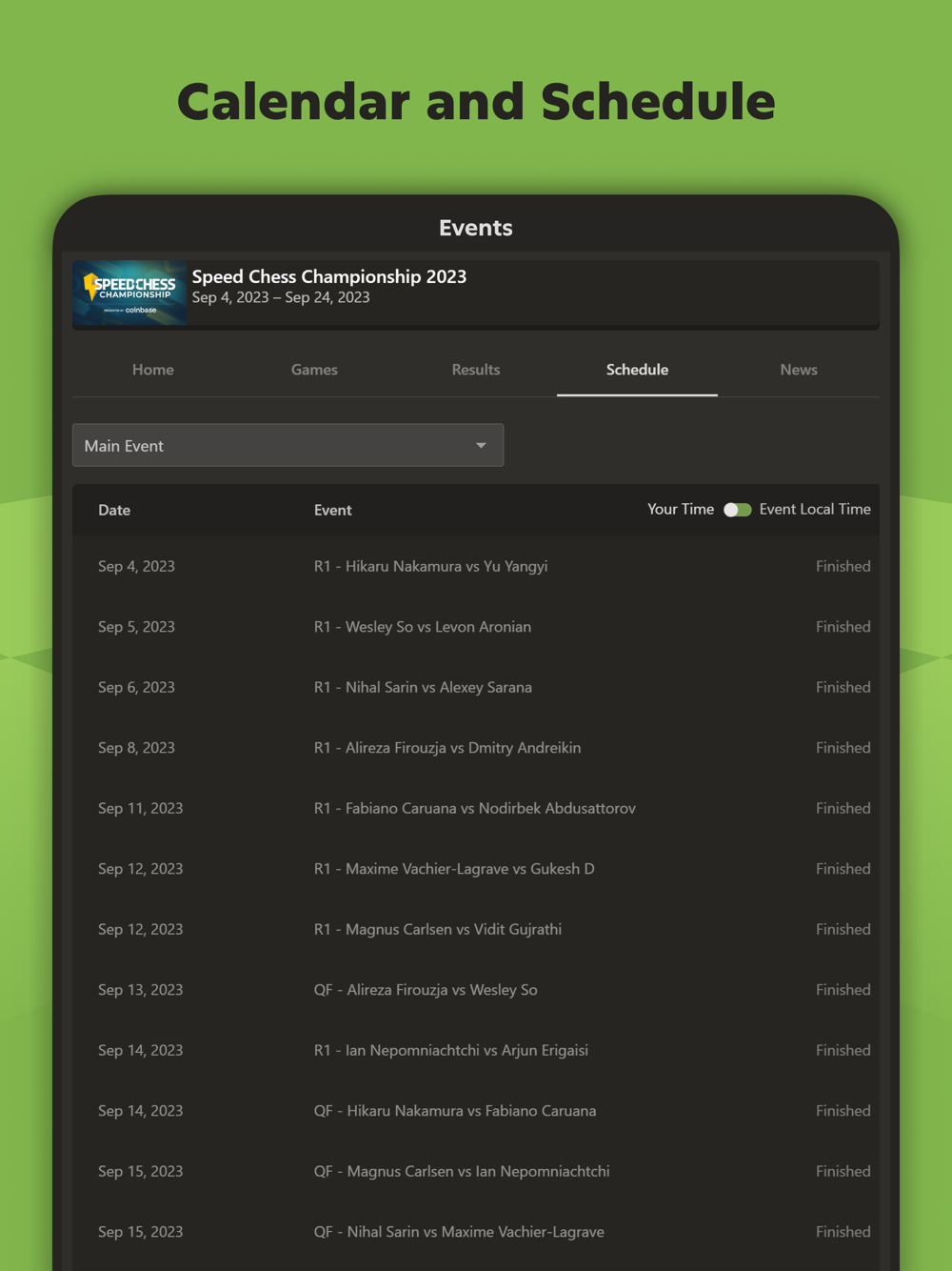 Stay up to date with top chess tournaments and events from around the world. Chess.com's Events app offers a dynamic hub for following live tournaments and events, keeping you at the forefront of the competitive chess scene. Witness the world's top grandmasters battle it out in prestigious events like the World Chess Championship, the Champions Chess Tour, or any other major chess event.