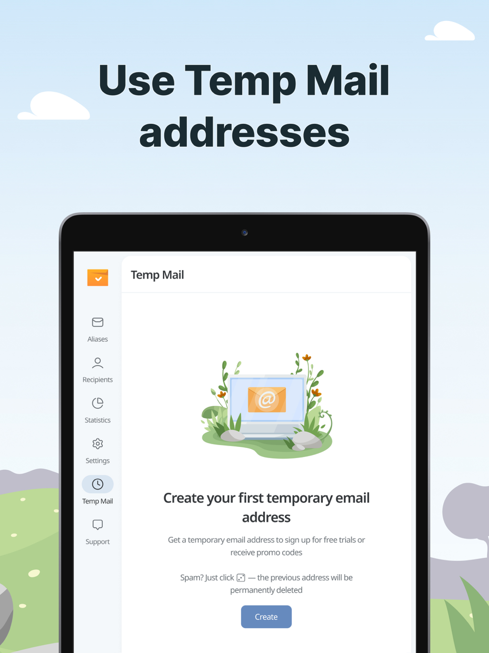 3. Évitez les spams dans votre boîte email principale : Utilisez des adresses e-mail temporaires pour les interactions rapides. Quand vous vous inscrivez à des essais gratuits, recevez des codes promotionnels ou participez à des forums en ligne, choisissez une adresse électronique jetable au lieu de votre adresse principale. Comme ça, vous éviterez d'encombrer votre boîte mail principale et la protégerez contre des spams éventuels. Les adresses électroniques temporaires sont un moyen sûr de gérer des interactions à court terme sans compromettre l'intégrité de votre adresse e-mail principale. En outre, tous les messages destinés aux adresses temporaires sont envoyés directement à votre boîte de réception dans AdGuard Mail. Contrairement aux alias, les adresses temporaires vous permettent de gérer rapidement vos abonnements de messagerie sans avoir à basculer entre votre service de messagerie principal et AdGuard Mail.