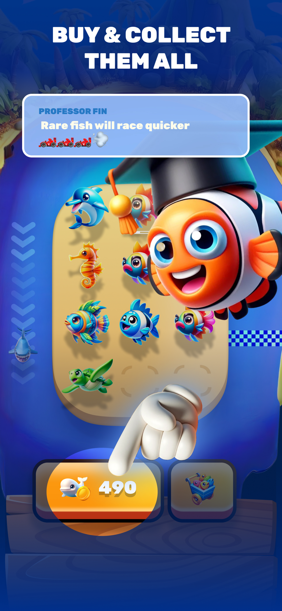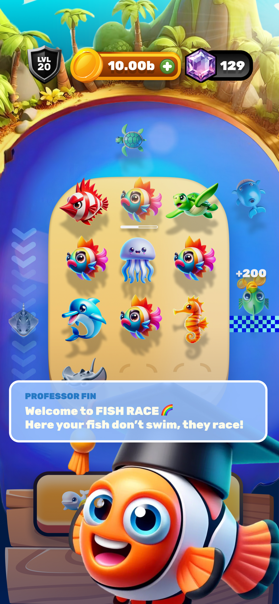 Collect over 30 unique fish, each with their own special abilities. Level up your fish to the maximum level of 30, and merge them to create even more powerful racers. Strategize your fish lineup for the best racing performance!