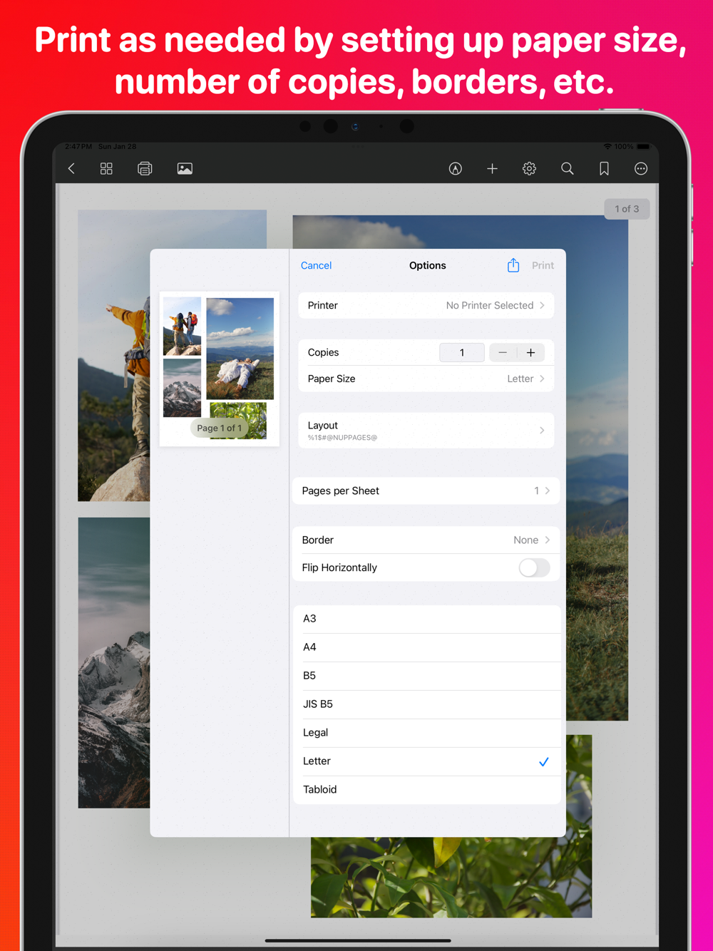 - 各PDFページに写真を簡単に配置してサイズを変更。