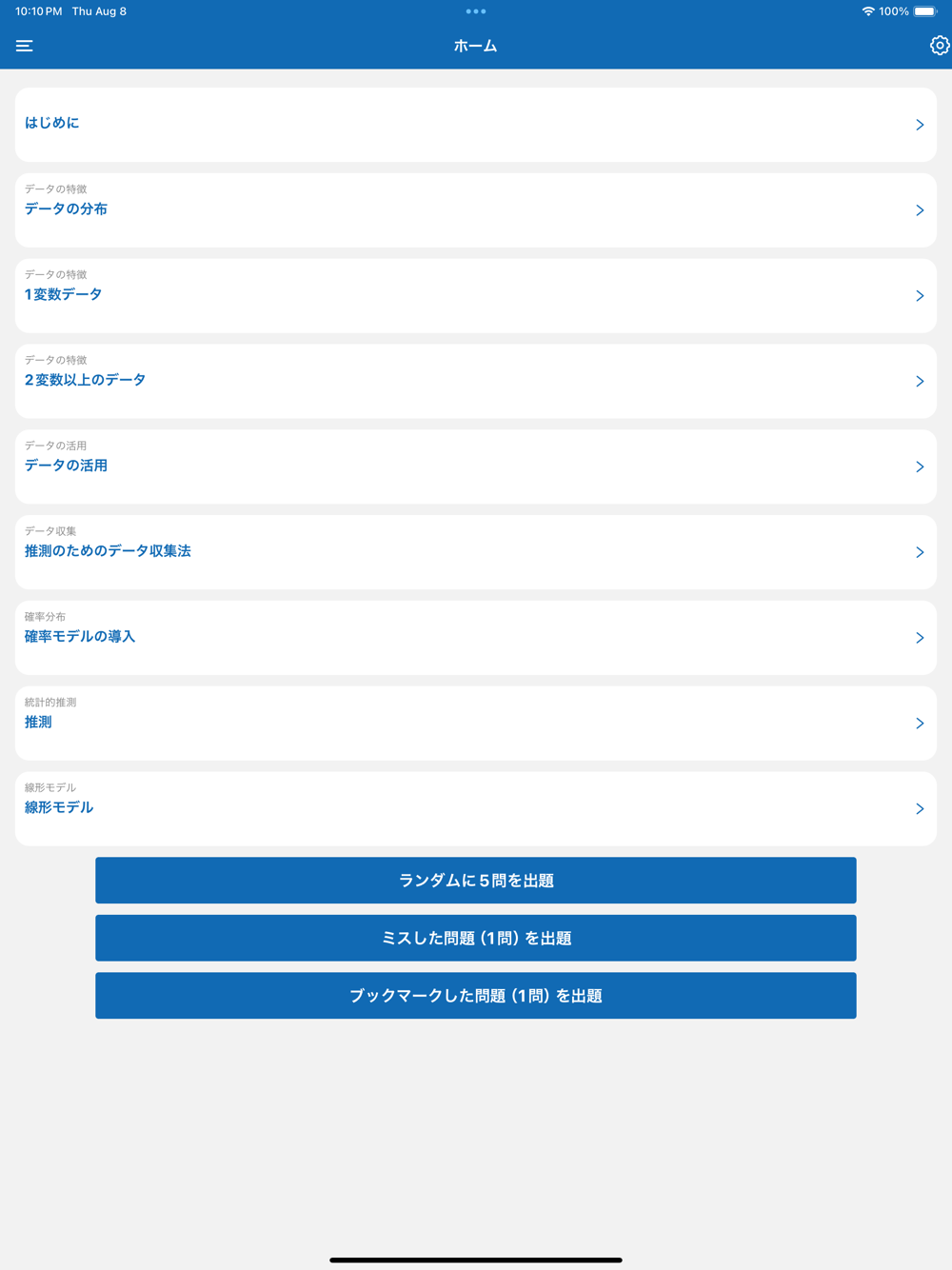 アプリでは、統計検定2級の出題範囲に基づいた下記の単元を収録しています。