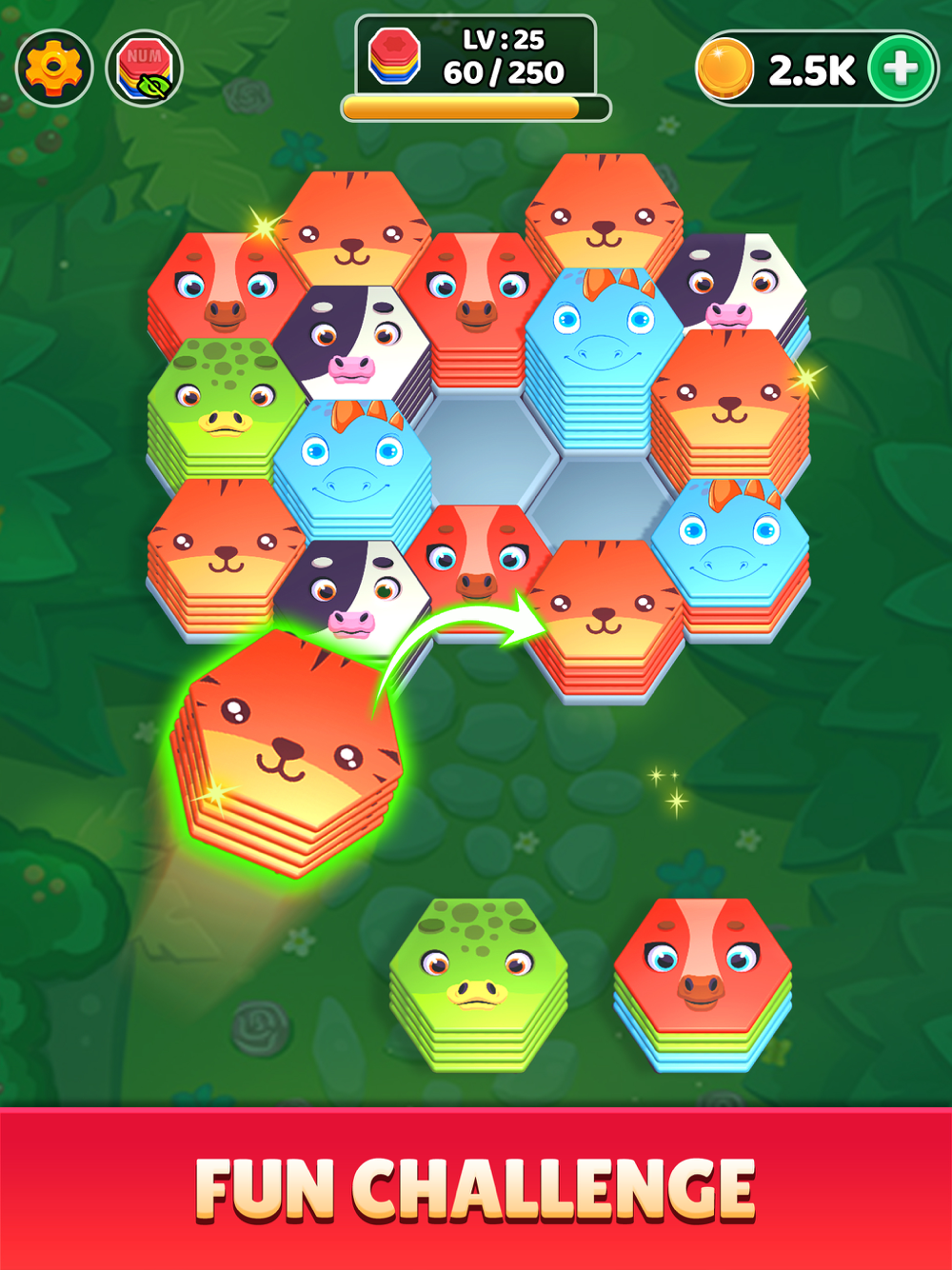 Hexa is a captivating color sorting game that challenges your spatial awareness and logic skills. Immerse yourself in this engaging puzzle experience where you strategically sort hexagonal blocks by color to fill the board and complete each level.