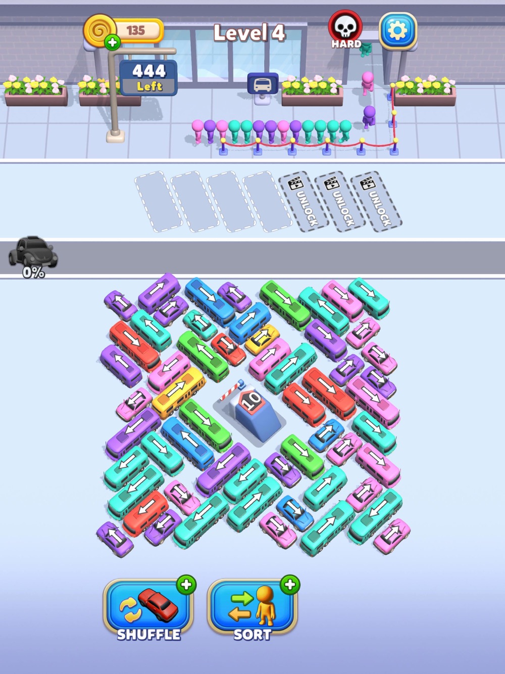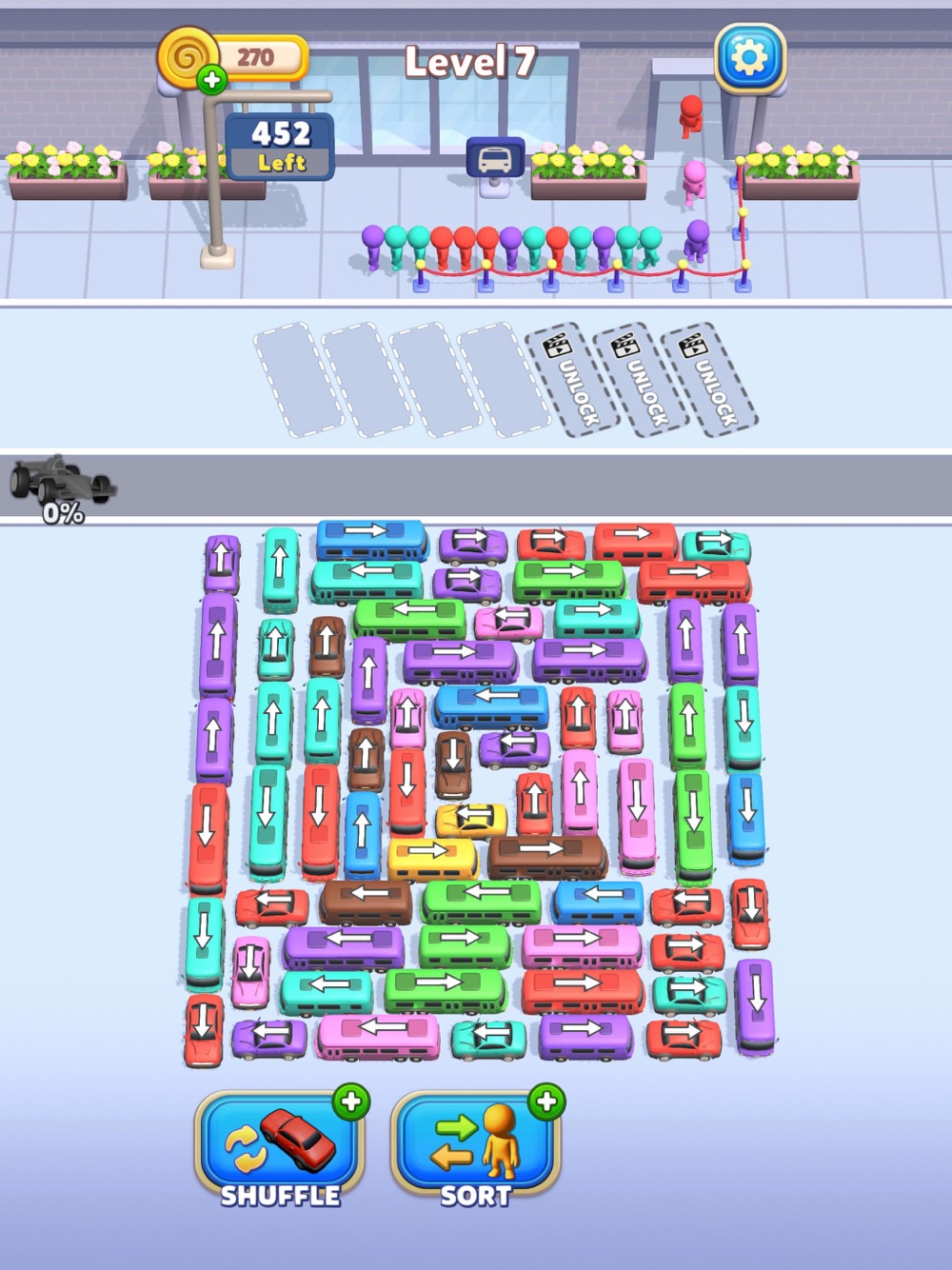 · Animações suaves: Aproveite as animações fluidas que tornam a jogabilidade mais agradável. Veja os carros deslizando pelo estacionamento e os passageiros entrando em seus veículos com transições suaves.
