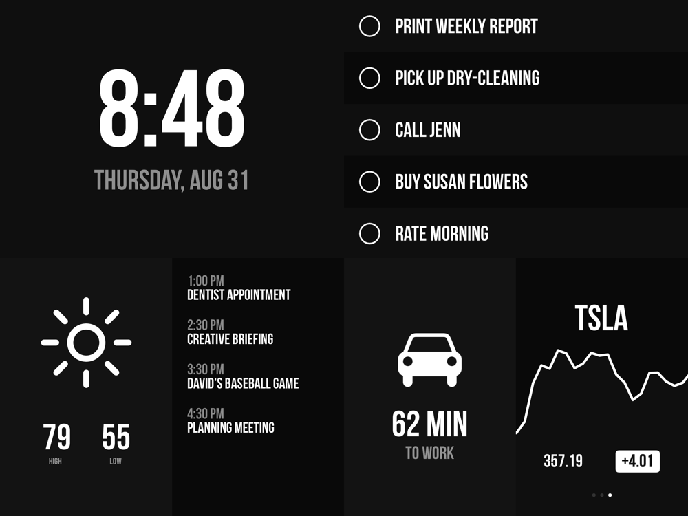 Morning is designed to make your routine easier than ever before. Keep track of time, stay updated, and start your day off right. With 8 customizable panels, the possibilities are endless. Staying organized has never looked this good.