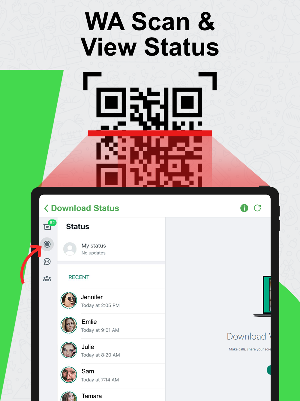 The Status Saver app allows you to save WA and WA Business status/stories. You just need to open WA Web and login by scanning QR code, then watch status you want to save. You will see button to save status. After save it will automatically store and save all images and video statuses in Status Saver Collection, where you can view and share all saved statuses. It's the best tool for saving the latest WA video / images statuses, eliminating the need to ask anyone to send them to you. All data is stored locally, we don't take access of your WA account like other app does, giving you more privacy and control to your account. Whether it's images or videos, the Status Saver app makes it simple and fast to save and store all statuses.