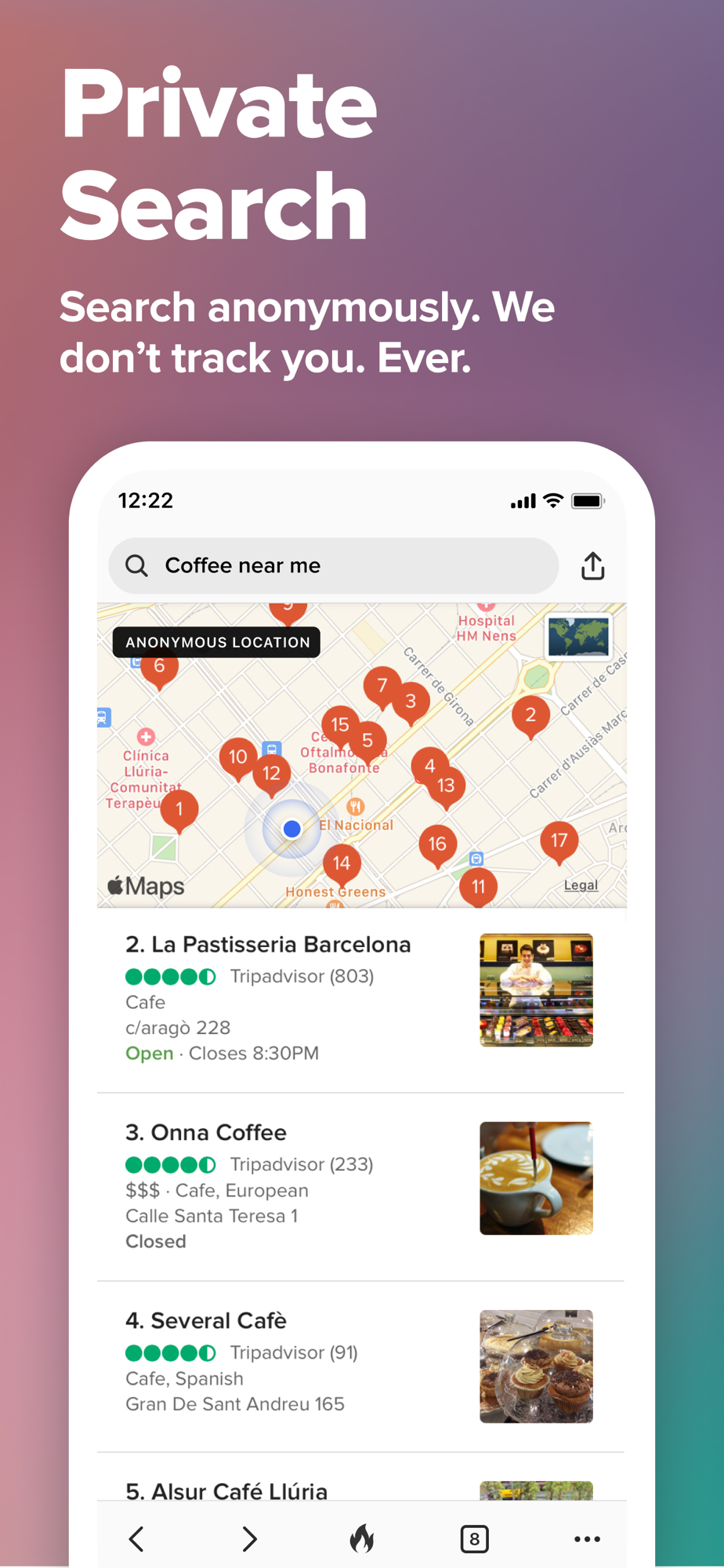 • Search Privately by Default - DuckDuckGo Private Search comes built in, so you can easily search the web without being tracked.