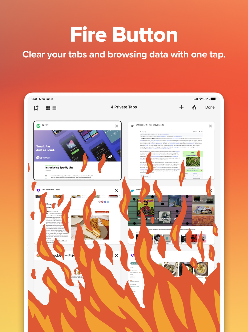 • Hit Fire Button, Burn Data - Clear your tabs and browsing data fast with our Fire Button.