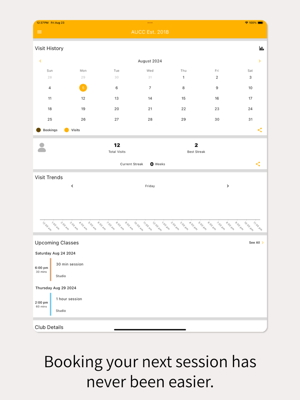 Schedule a session or book into a Class. You can check in on future bookings and make any changes as needed.