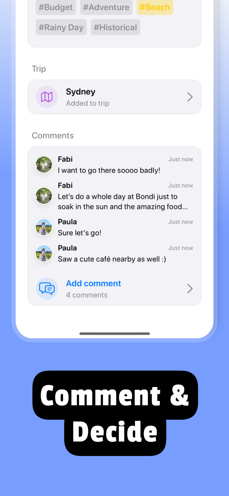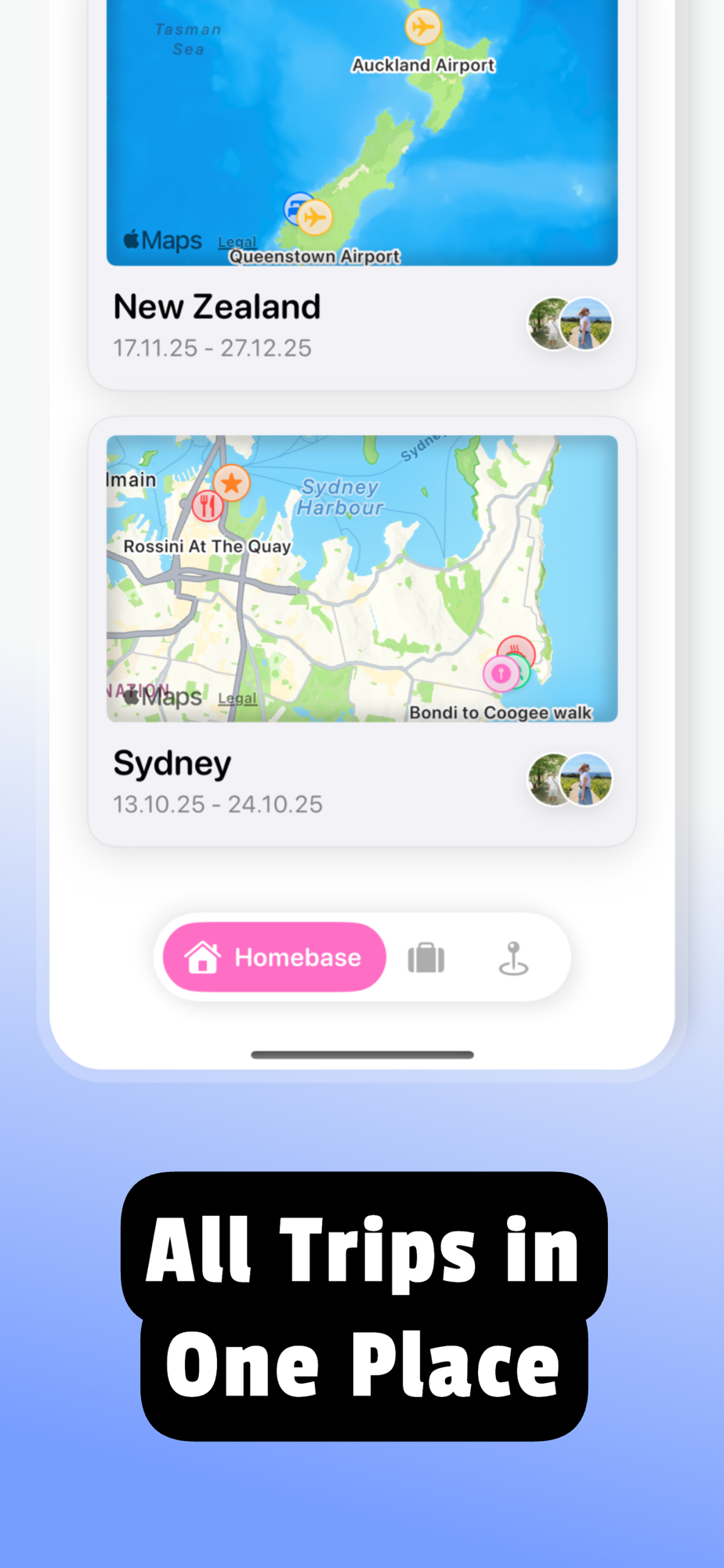 Discover and collect destinations individually or with friends. Save interesting places you find online, get recommendations from your travel buddies, and build your personal bucket list. Later, easily add these collected destinations to any trip itinerary with just a tap.