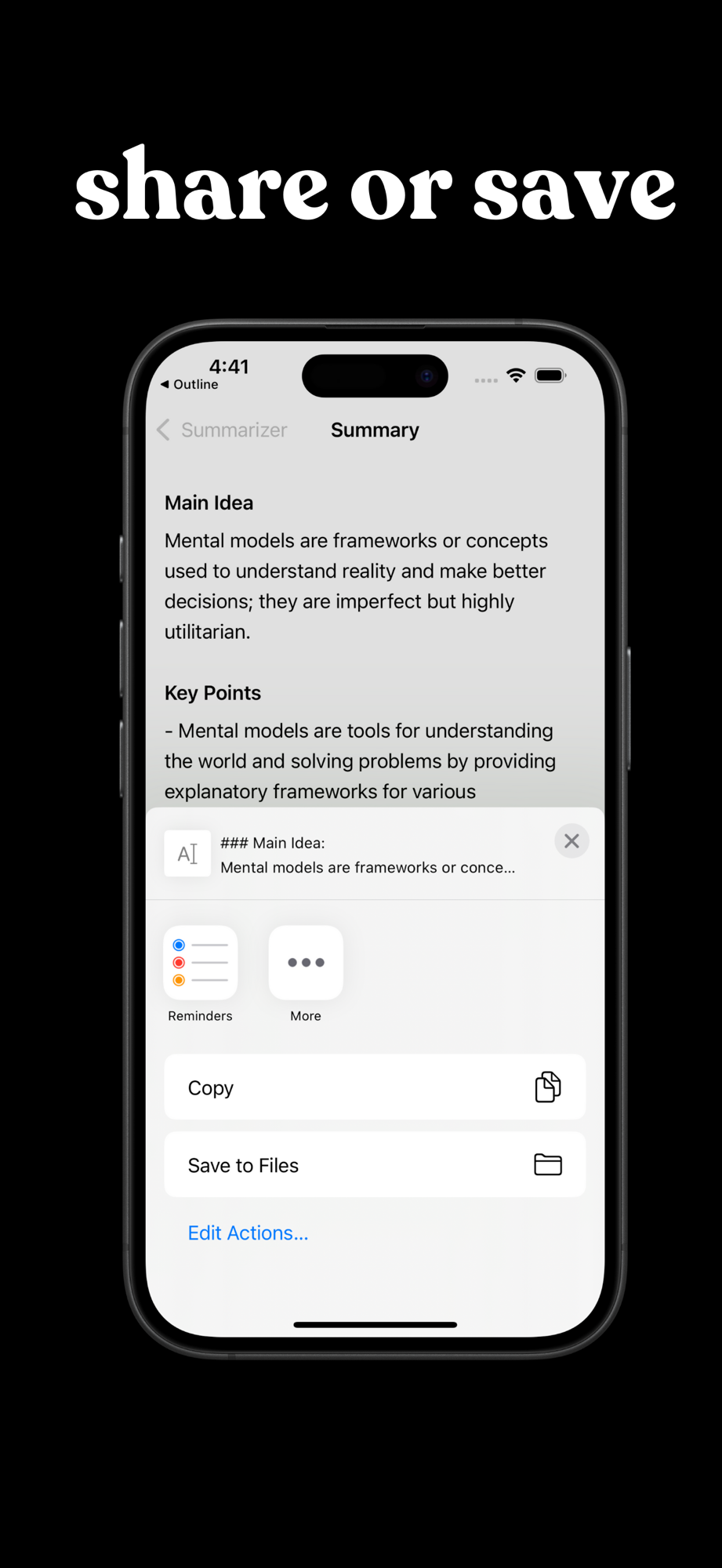 Use the iOS native share button to send summaries directly to your favorite apps, like Notes, Mail, or even social media.