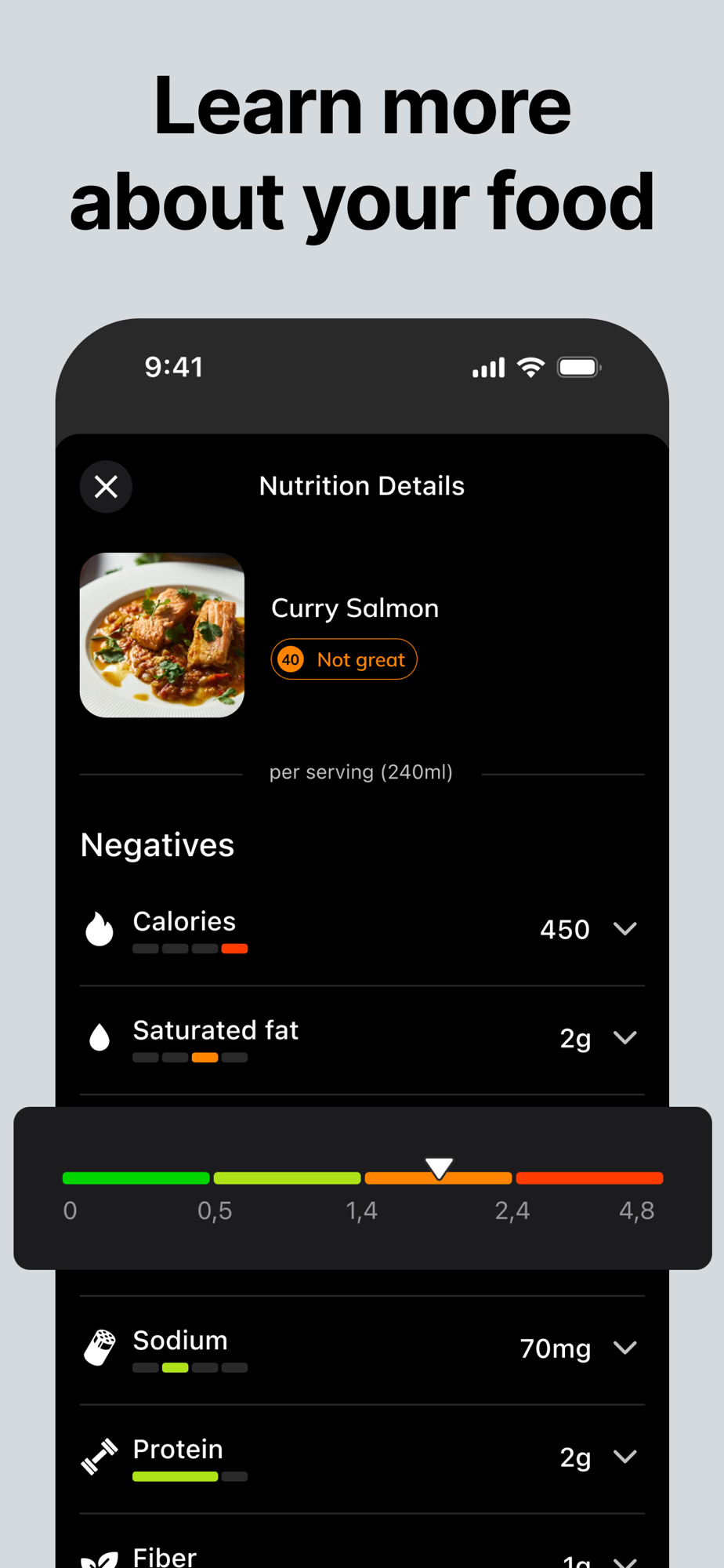 Quickly scan the barcode of any food product to get instant nutrition insights. Discover its calorie count, ingredients, and overall health rating based on the latest nutrition research. FoodGo highlights the good (like healthy fiber) and warns you about the bad (like excessive sugar or additives).