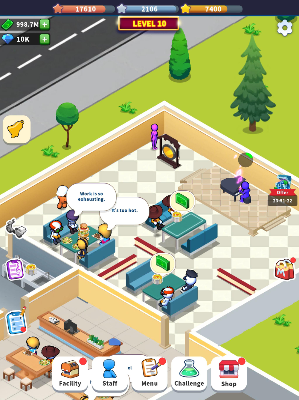 As the manager, it’s your job to turn things around! You’ll need to upgrade your dishes, purchase items for the restaurant, and train your staffs to deliver exceptional service. Keep an eye on customer feedback and make adjustments to your menu to satisfy their cravings. Expand your restaurant’s space by unlocking new areas and enhancing the decor to create a welcoming atmosphere.