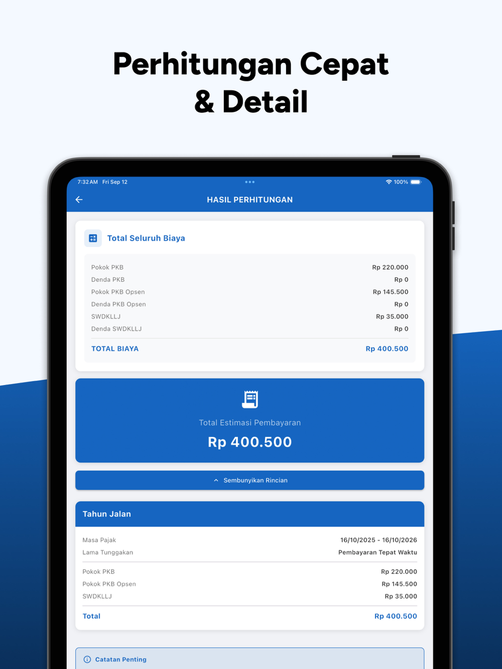 Dapatkan gambaran rincian dari estimasi tagihan Anda. Mulai dari pokok pajak, PKB Opsen, SWDKLLJ, biaya administrasi, hingga denda keterlambatan (jika ada). Rincian ini membantu Anda memahami komponen-komponen pajak.