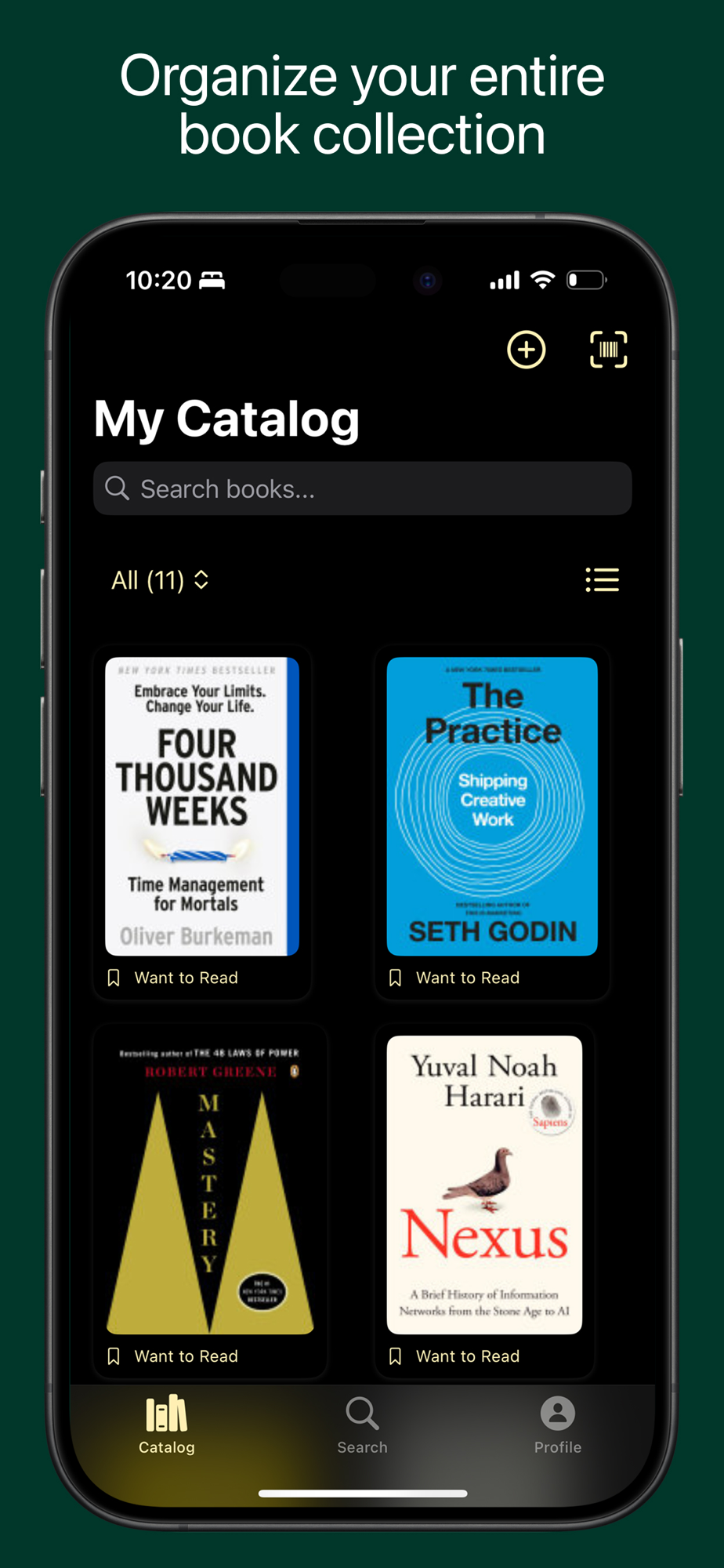- Scan barcodes or search to pull titles, authors, covers, and details automatically