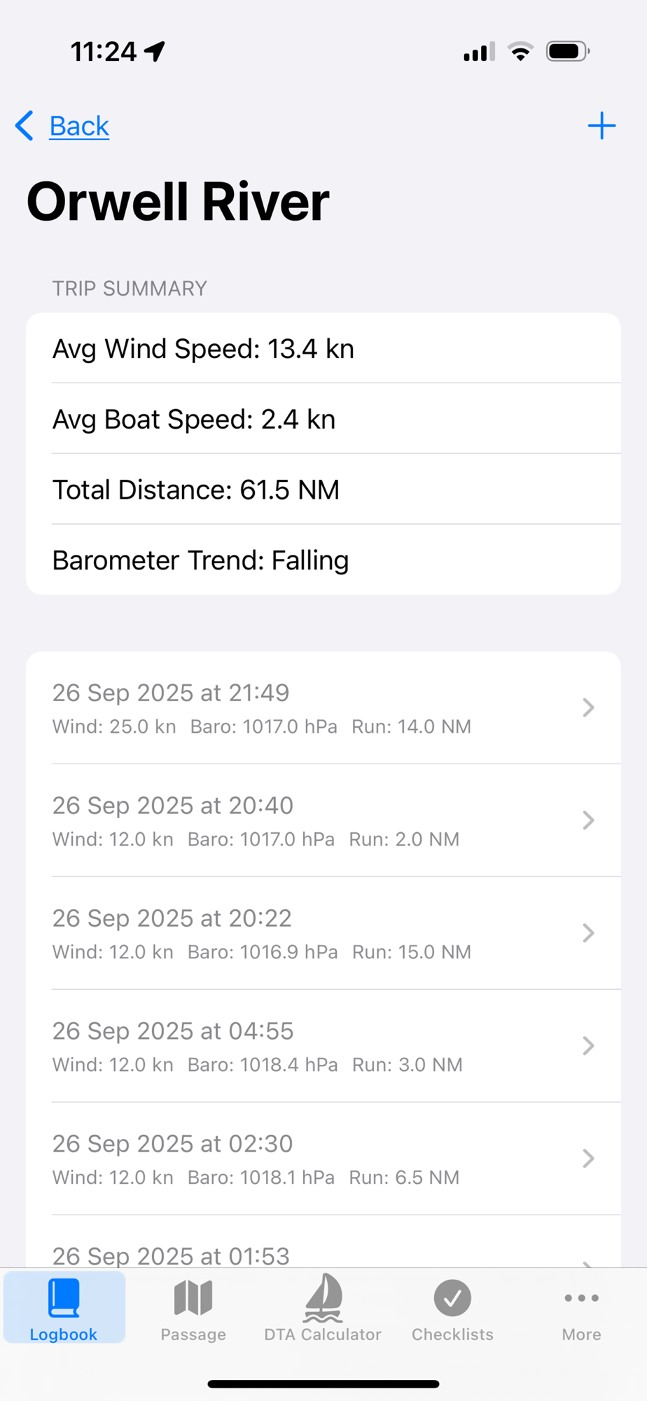 Logbook: Meticulously records all voyage details (position, weather, course, distance), with crucial entries like position and barometer potentially auto-filled by the phone’s sensors. Trip summary previews show average boat speed, wind speed, total distance traveled, and barometer trends.