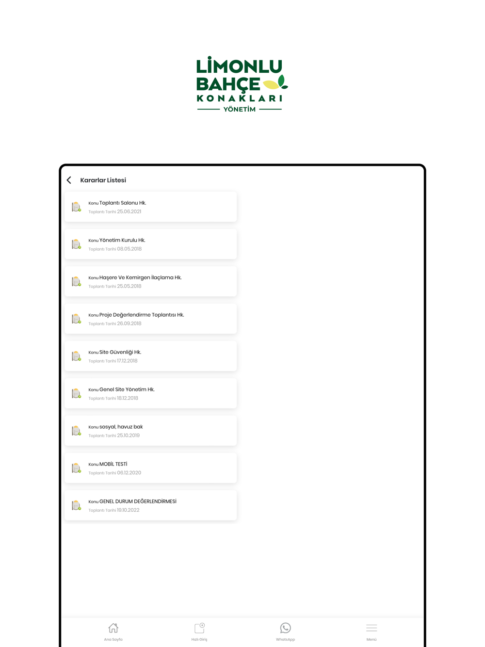 • Araç Listesi; Bağımsız bölümünüze tanımlı araçlarınızı ve detay bilgilerini görüntüleme,
