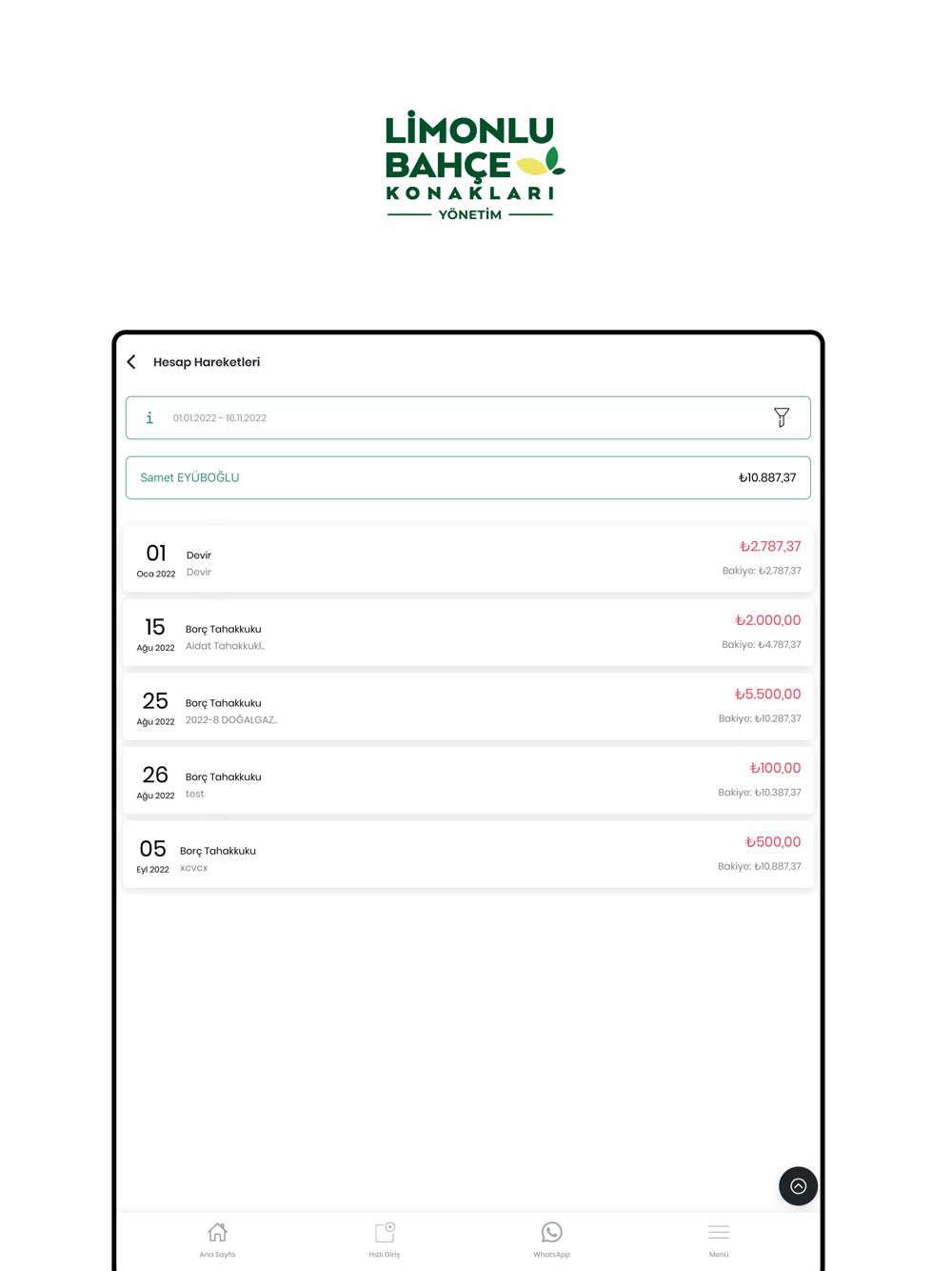 • Cari Hesap Hareketleri; bölümünüze yapılan tahakkukları , güncel borç durumunu ve geçmiş dönemde gerçekleşen ödemelerinizi görüntüleme,