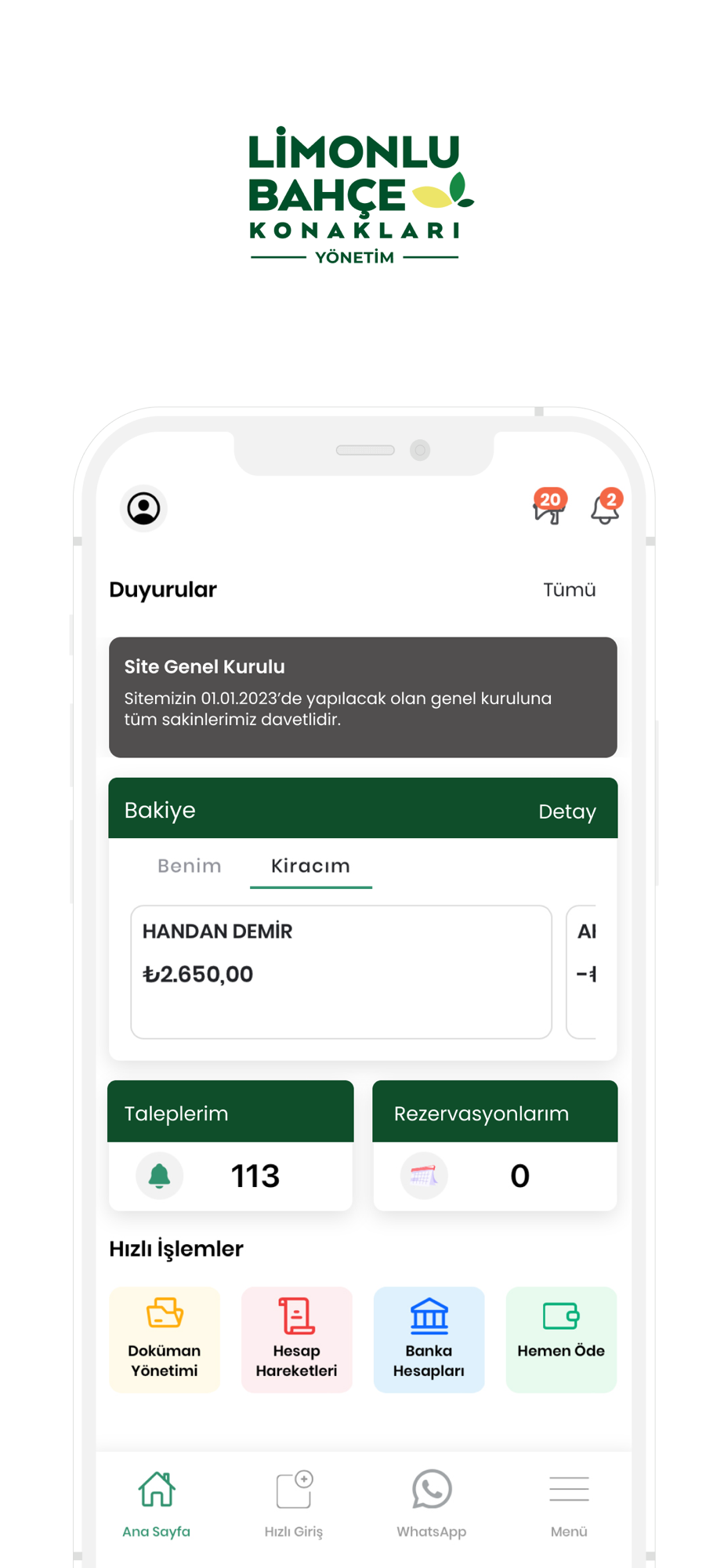 • Banka Bilgileri; Site Yönetimine ait banka hesap bilgilerini görüntüleyebilme.
