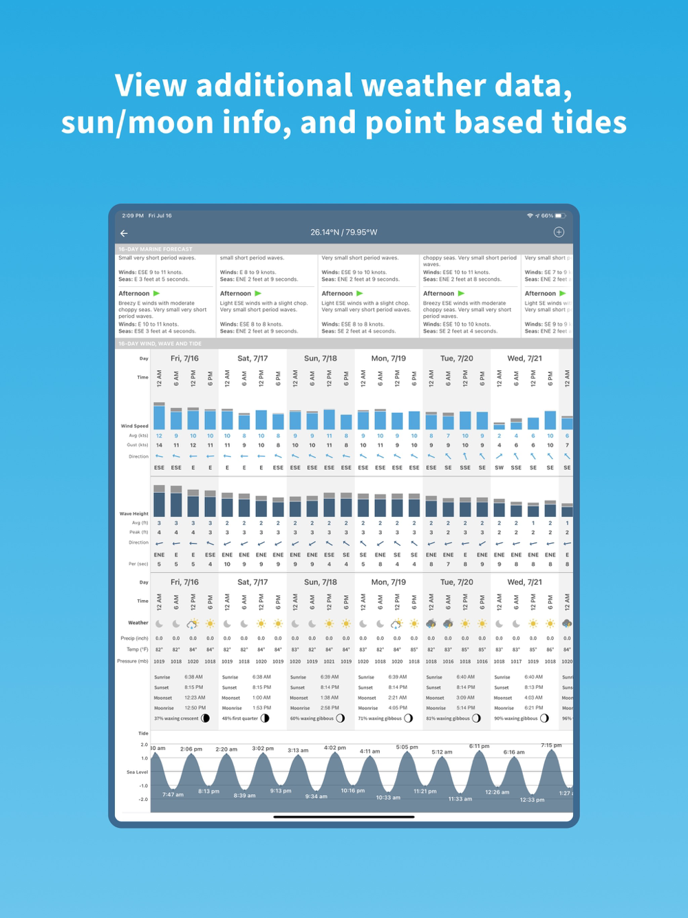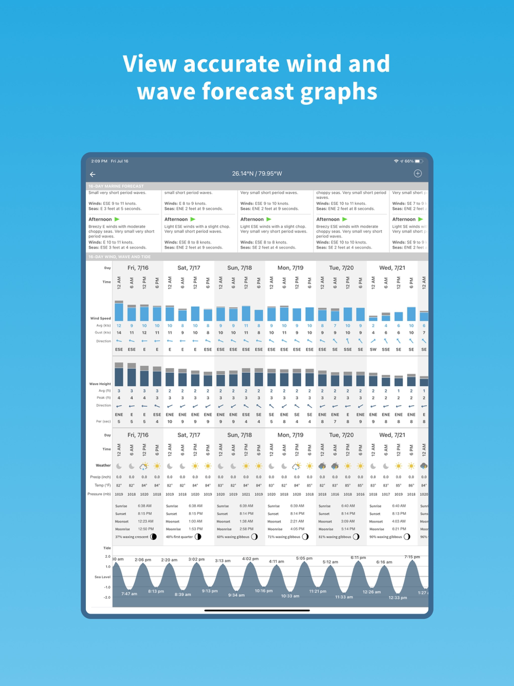 - Plan future ocean adventures. Buoyweather allows you to check weather, wind, wave, and tide forecasts for any point offshore up to 16 days out. Plus, you can save an unlimited number of favorite points for easy access while you are on the dock or out at sea.