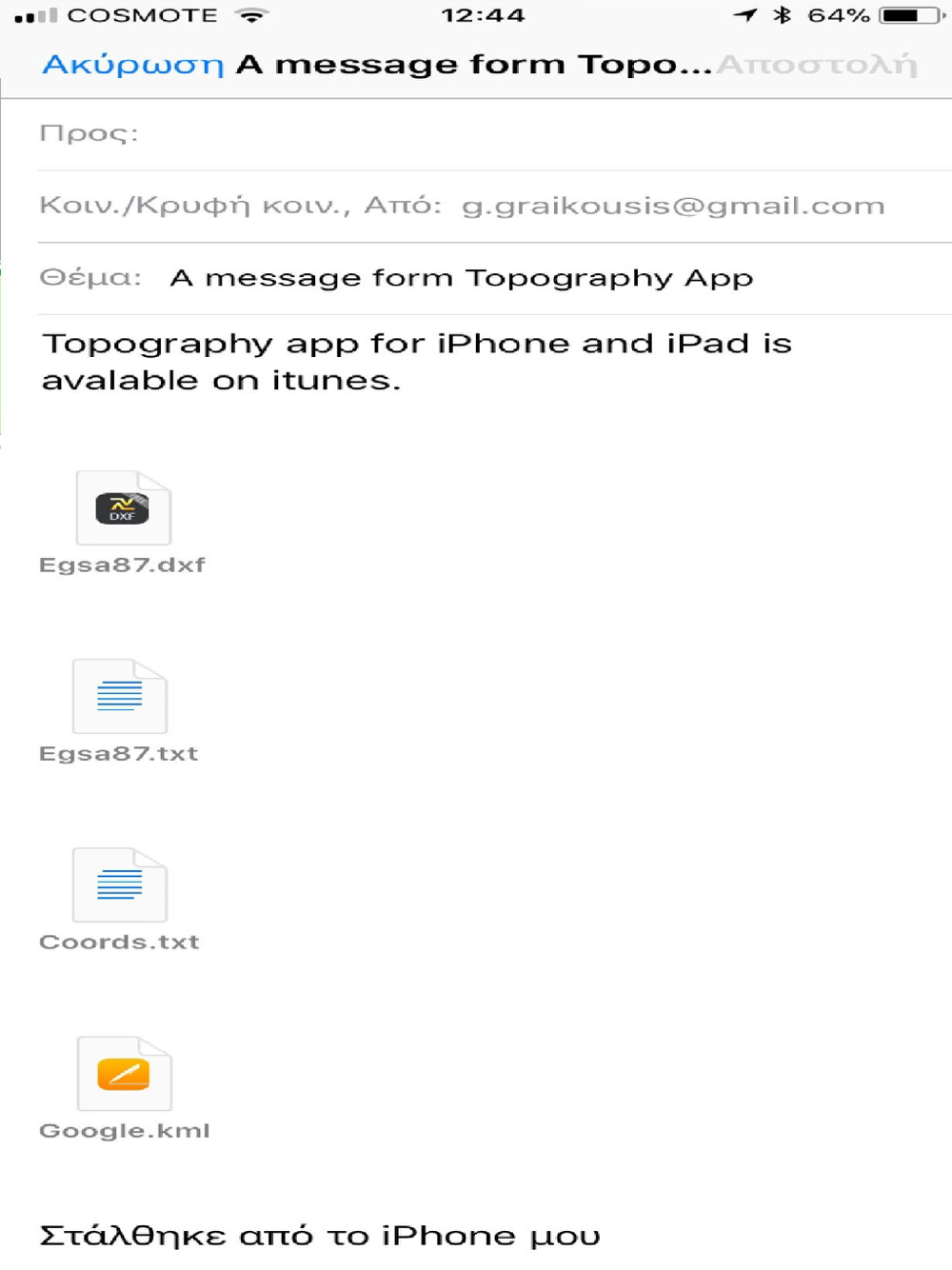 5. Send measurements by e-mail in [TXT] file format. The text file contains coordinates either in EGSA87 Datum or Latitude and Longitude in decimal degrees.