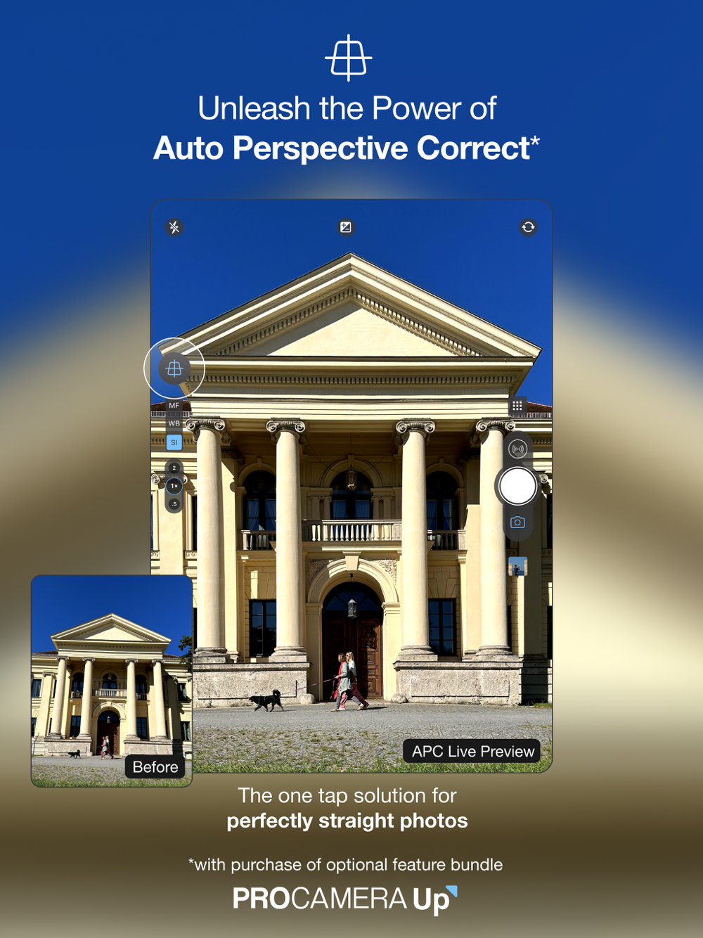 Upgrade to ProCamera Up for access to exclusive features such as Auto Perspective Correct with Live Preview for professional-looking photos free of perspective distortion, Custom Camera Presets (Exposure, WB, Focus), Anamorphic Lens Support, (RAW) Exposure Bracketing, safeguarded Private Lightbox folder, and specialty photo filter sets. The optional upgrade is available as a one-time purchase or as a subscription. Terms & Conditions: https://procameraterms.cocologics.com