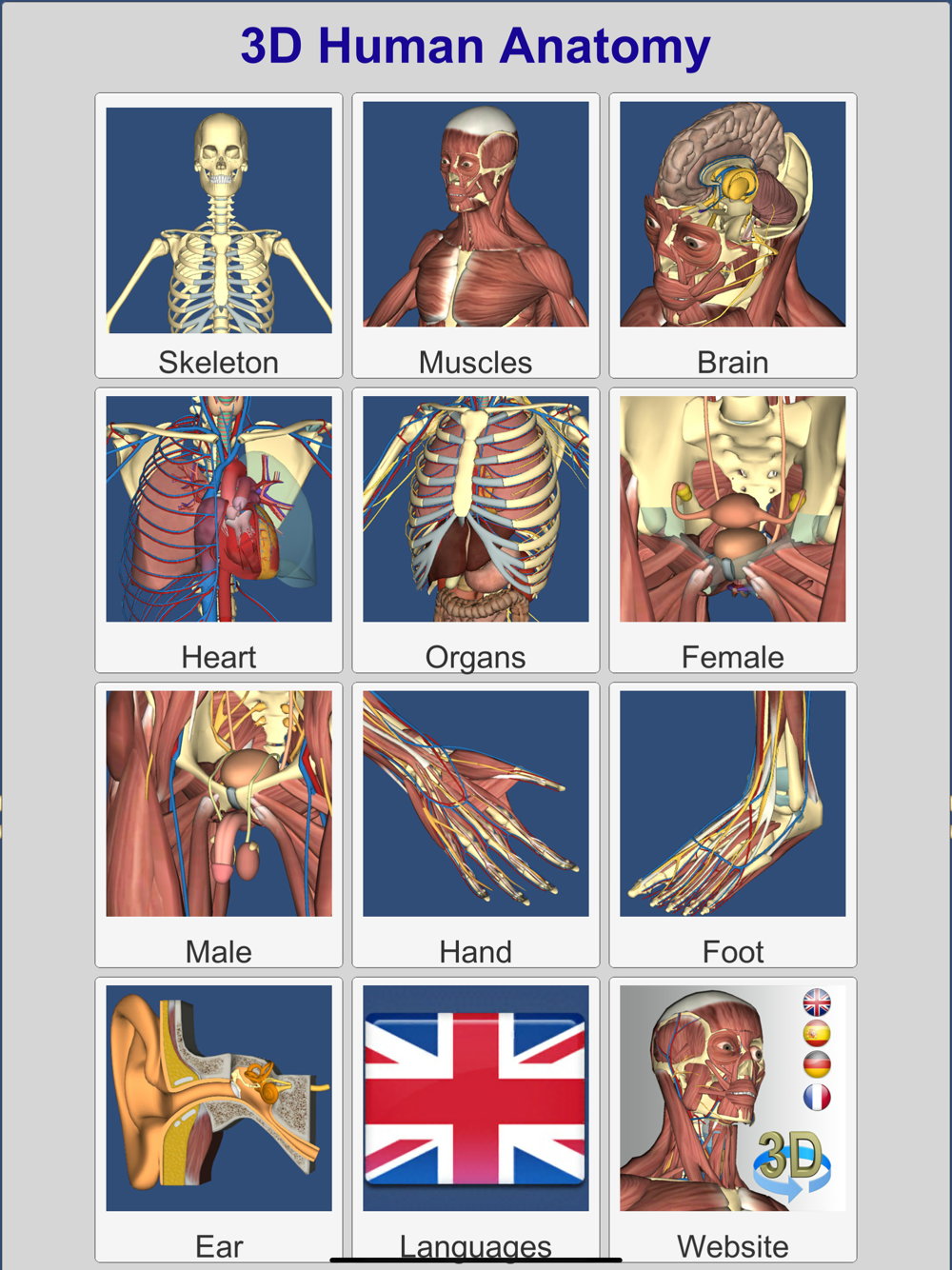 A true and totally 3D app for learning human anatomy with 3D position quiz and audio pronunciation, built on an advanced interactive 3D touch interface.