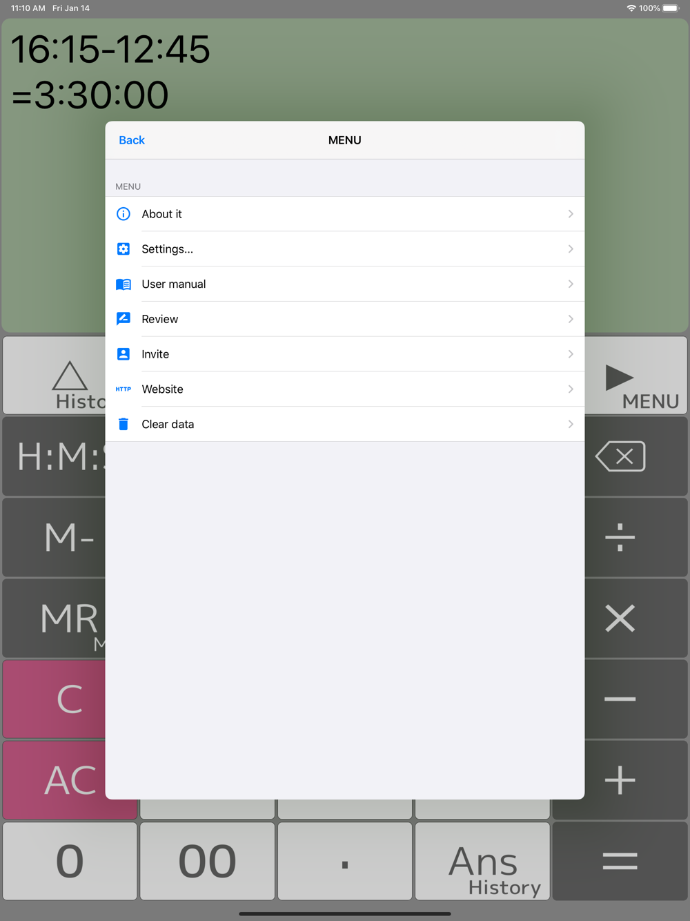 - Four arithmetic operations, root, percentages, time, tax and parentheses calculations