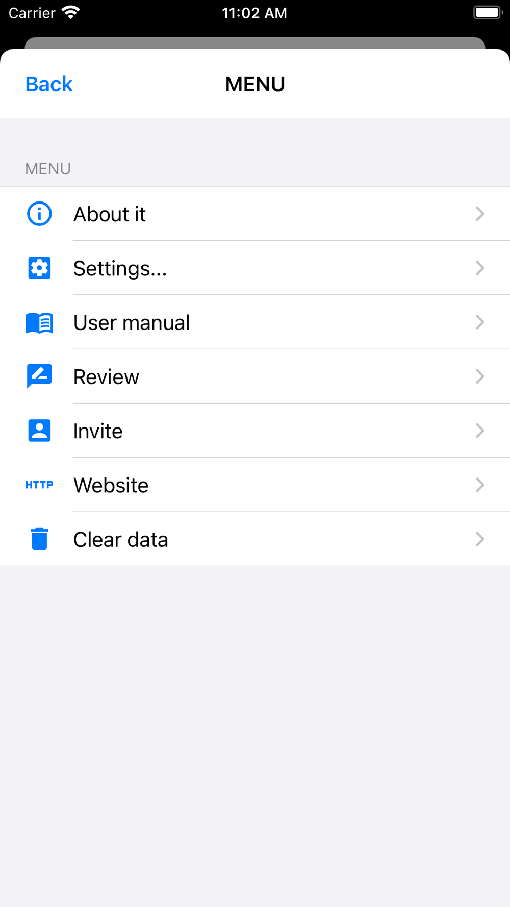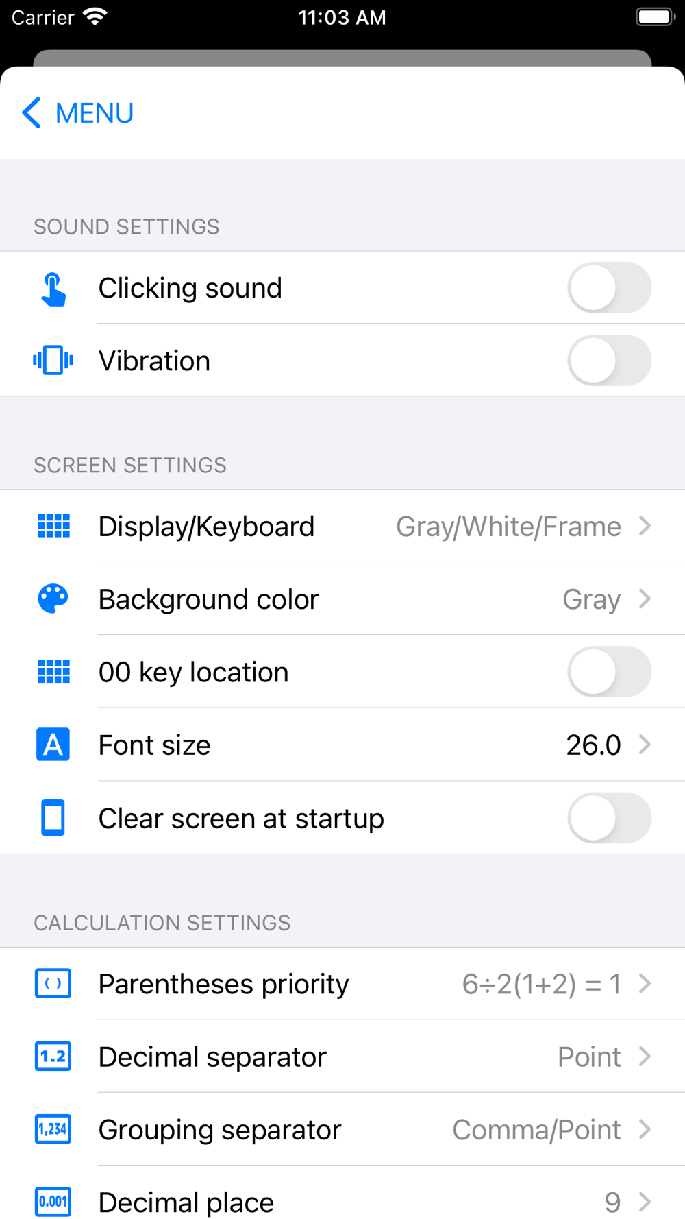 - Various settings (Long tap MENU key)