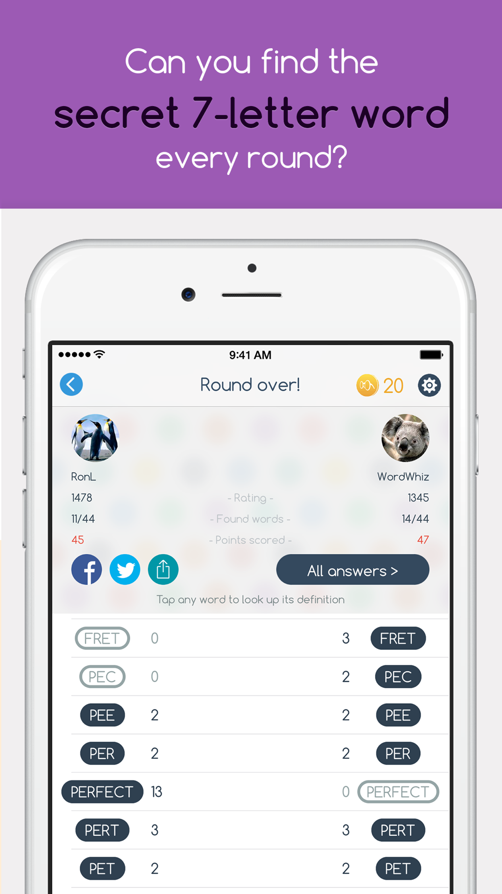 * Earn coins just by challenging your friends! Redeem coins for hints or to upgrade to WordHub Pro and get full access to answers and stats.