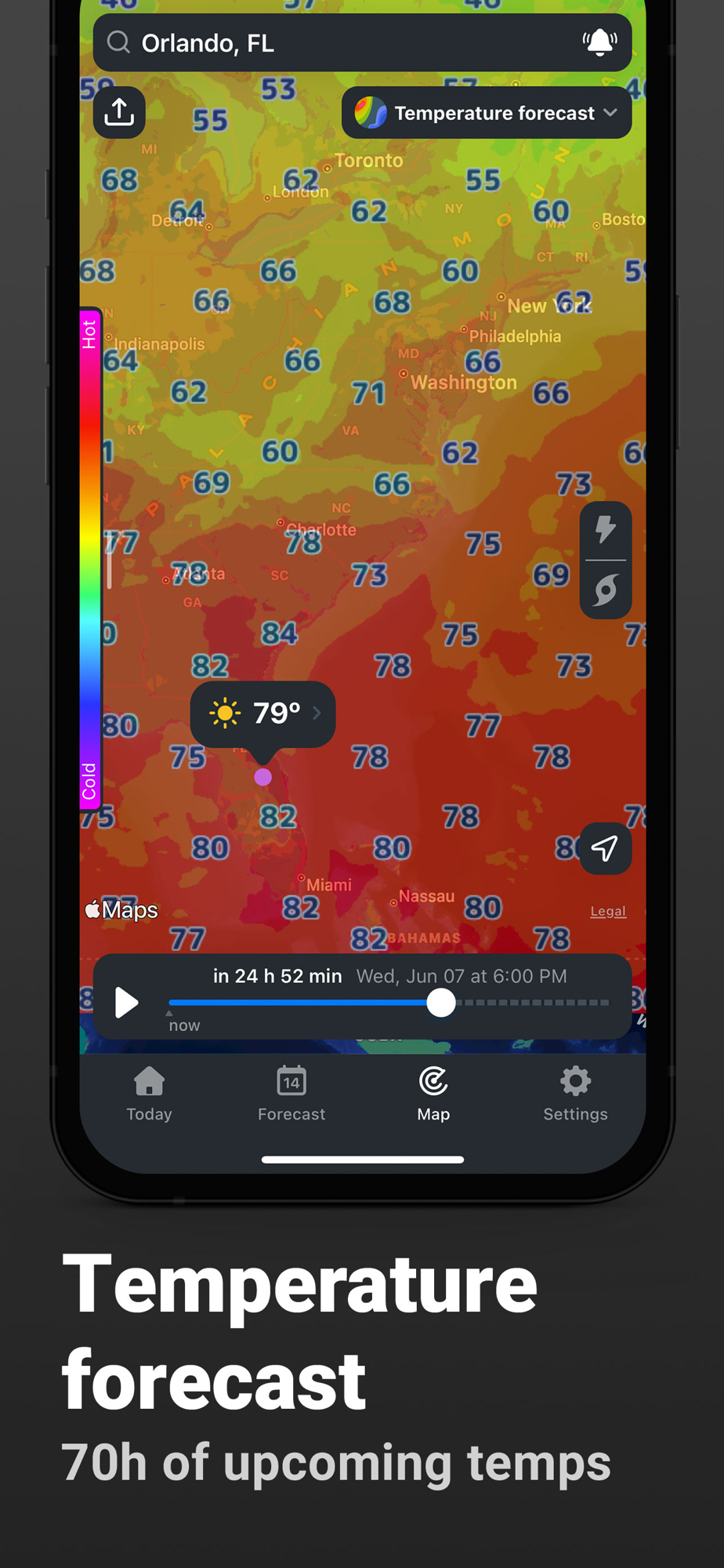 - Receive push notifications whenever there’s a weather alert for the bookmarked location (tornadoes, hurricanes, freeze warnings, and more);